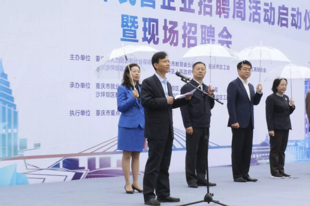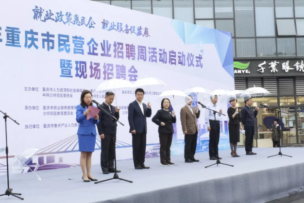 就业政策惠民企,就业服务促发展,4月15日,2019年重庆市民营企业招聘周活动启动仪式暨现场招聘会正式开幕。启动仪式在沙坪坝熙街举行,重庆市人力资源和社保局局长陈元春等领导、足下软件学院与重庆市知名民营企业代表受邀出席开幕式。