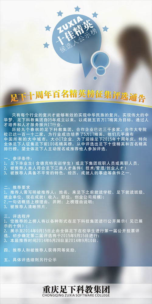 为了迎接足下2015年十周年庆,特向全体足下人征集足下前100名精英榜,从中评选出足下十佳精英和百名精英排行榜,望全体足下人主动报名或推荐他人参加评选。