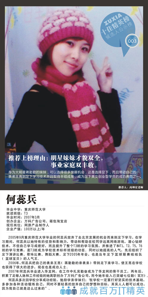 技术,不但自己学习成绩好,而且提升了整个T3班的学习氛围,并推进了和T1、T2、T5、T6班的学习竞赛,是T3班成为学校技术标杆班级的功臣。同时以她超高的人气,先后组织了足下演讲比赛、歌咏比赛、舞蹈大赛、足下2005年年会,也是当年足下篮球联赛啦啦队