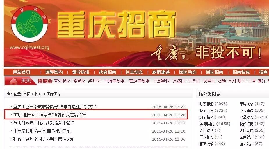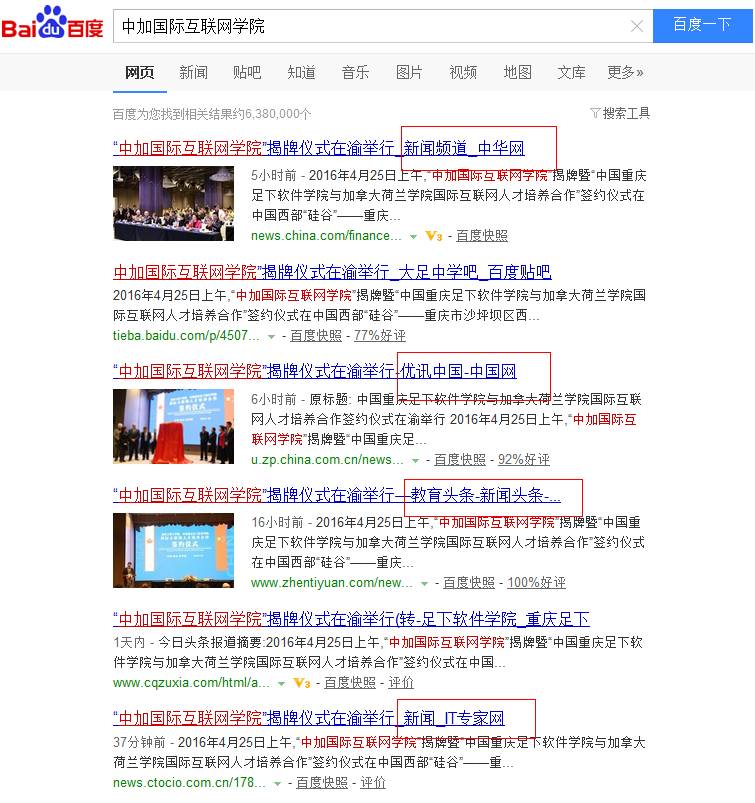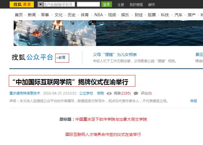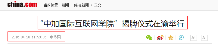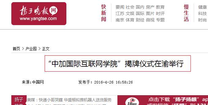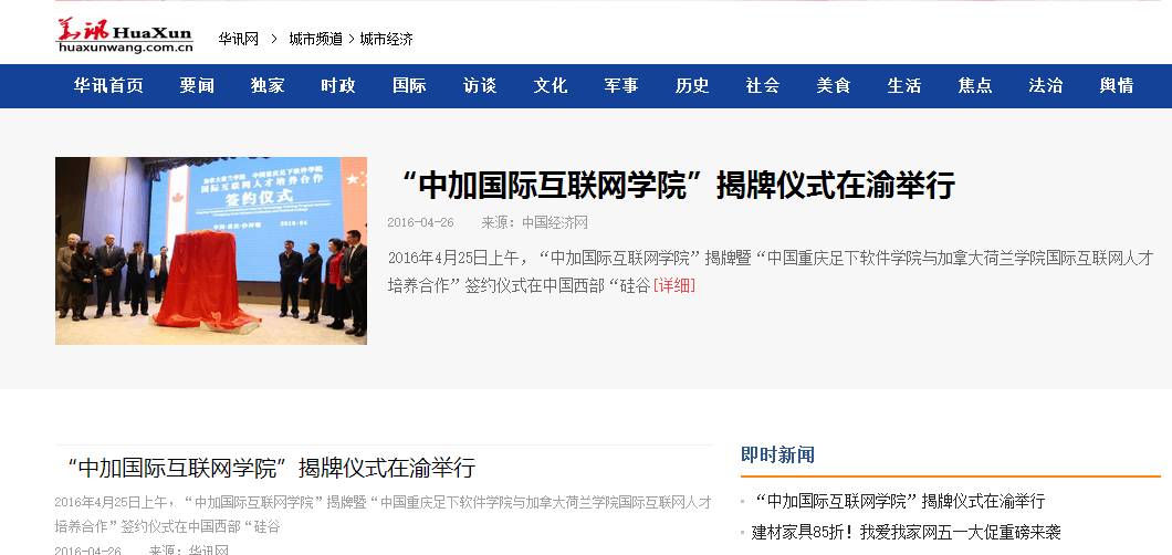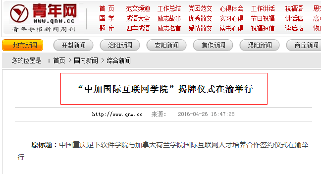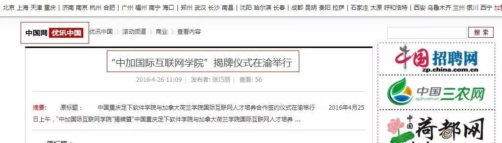 2016年4月25日上午,“中加国际互联网学院”揭牌暨“中国重庆足下软件学院与加拿大荷兰学院国际互联网人才培养合作”签约仪式在中国西部“硅谷”——重庆市沙坪坝区西永微电园圆满举行。多名相关重要领导出席、来自各界的专家、媒体和重庆足下软件学院300多名师生见证了这一历史性时刻。此次签约是加拿大荷兰学院第一次与重庆的院校合作,具有重要意义,这标志着重庆足下软件学院开始走向国际化,也将对中国职业教育发展和国际互联网人才培养起到积极的推动作用。此重磅新闻消息一出,多家新闻媒体纷纷转载报道,重庆足下软件学院再次成为了“焦点”。