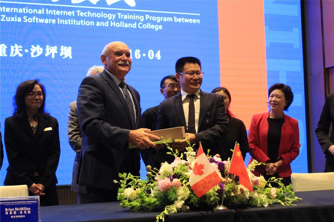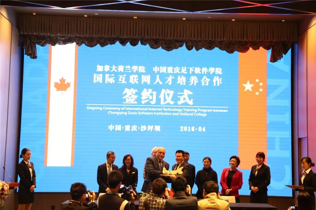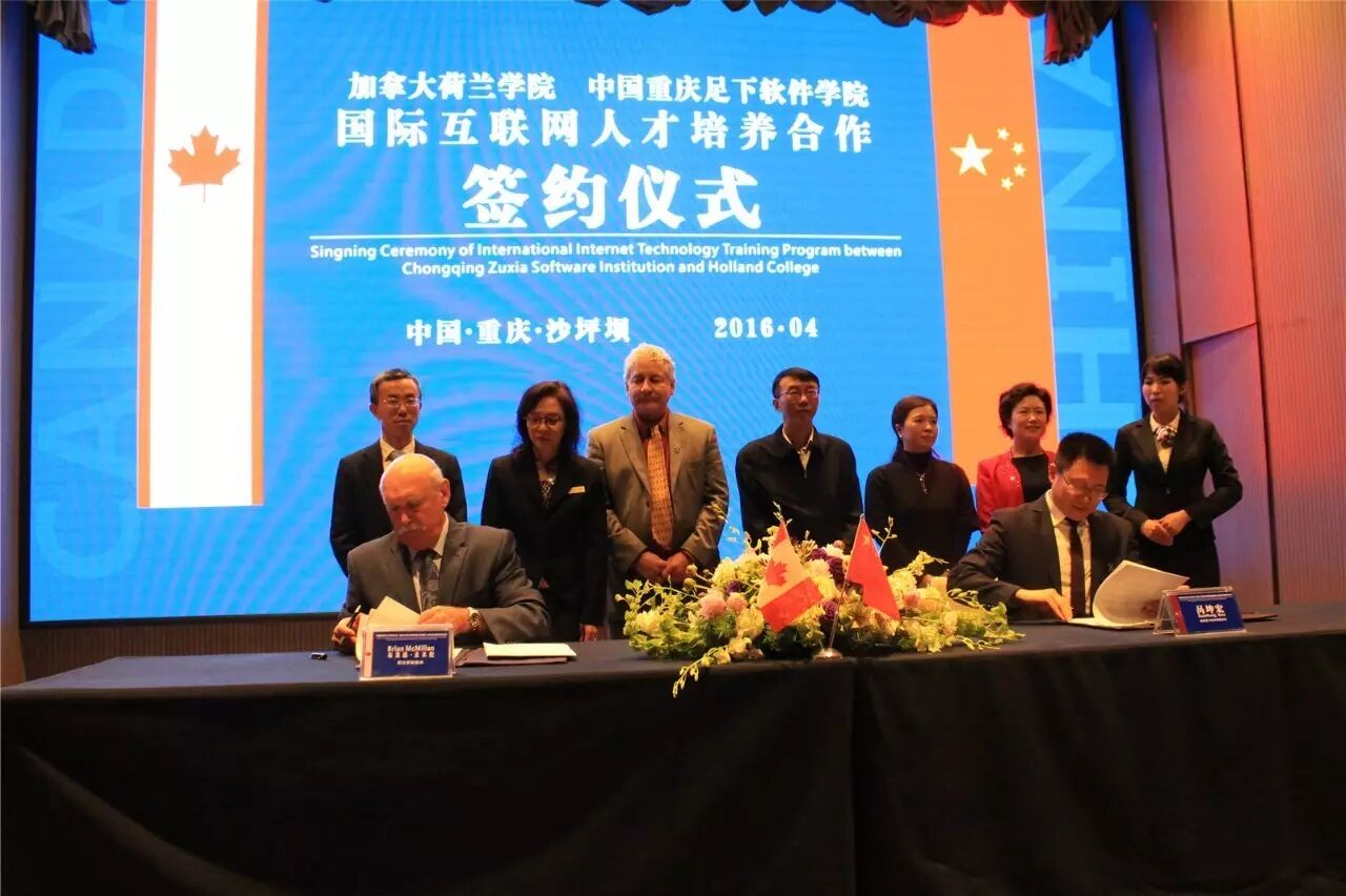 2016年4月25日上午,“中加国际互联网学院”揭牌暨“中国重庆足下软件学院与加拿大荷兰学院国际互联网人才培养合作”签约仪式在中国西部“硅谷”——重庆市沙坪坝区西永微电园圆满举行。多名相关重要领导出席、来自各界的专家、媒体和重庆足下软件学院300多名师生见证了这一历史性时刻。此次签约是加拿大荷兰学院第一次与重庆的院校合作,具有重要意义,这标志着重庆足下软件学院开始走向国际化,也将对中国职业教育发展和国际互联网人才培养起到积极的推动作用。数十家新闻媒体对此次签约进行了专题报道。