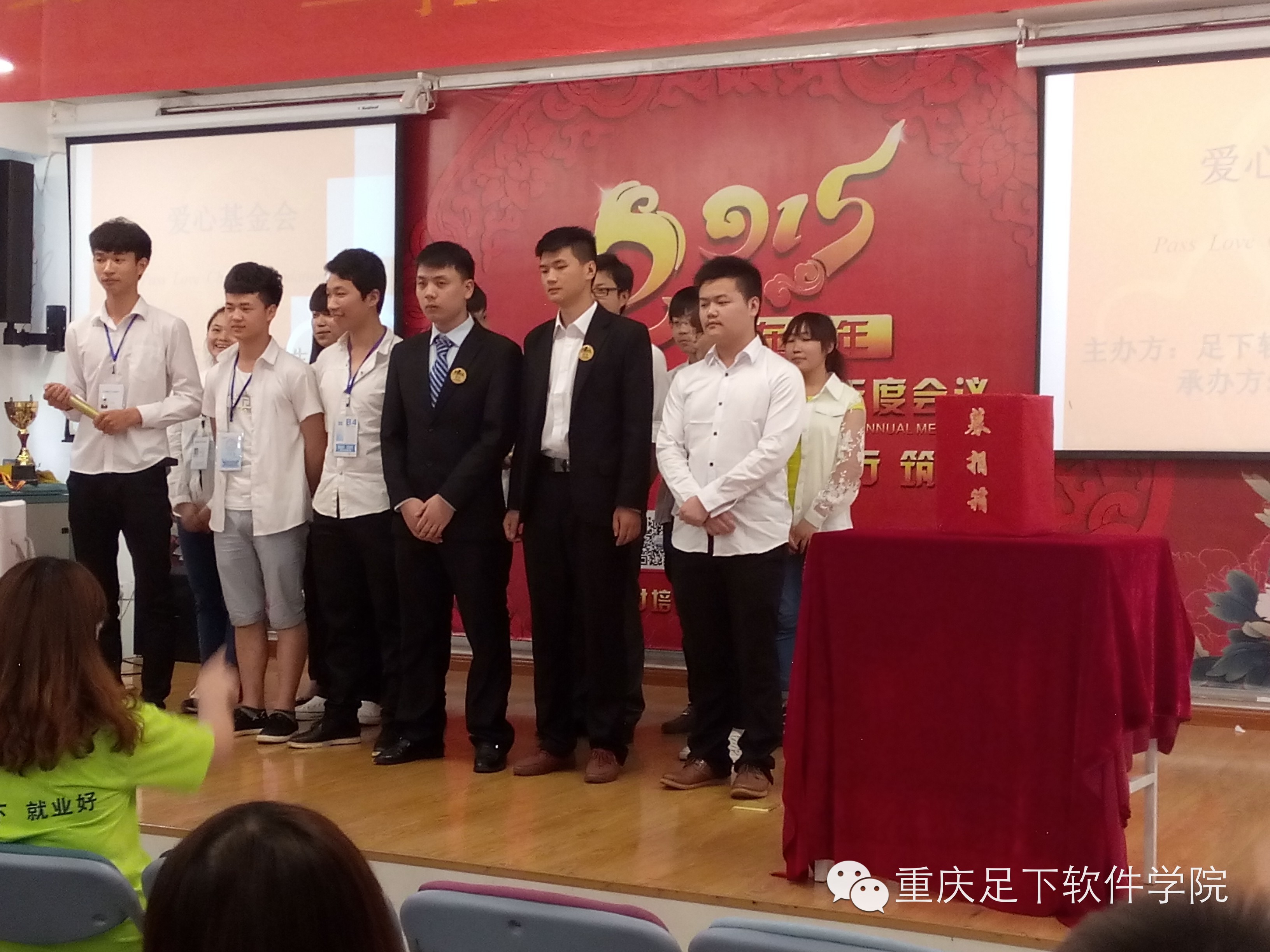 学生会主席致辞完毕后,由他组织带领了学生会各部门负责人合唱了《爱,因为在心中》,激发了参会人员的爱心意识。
