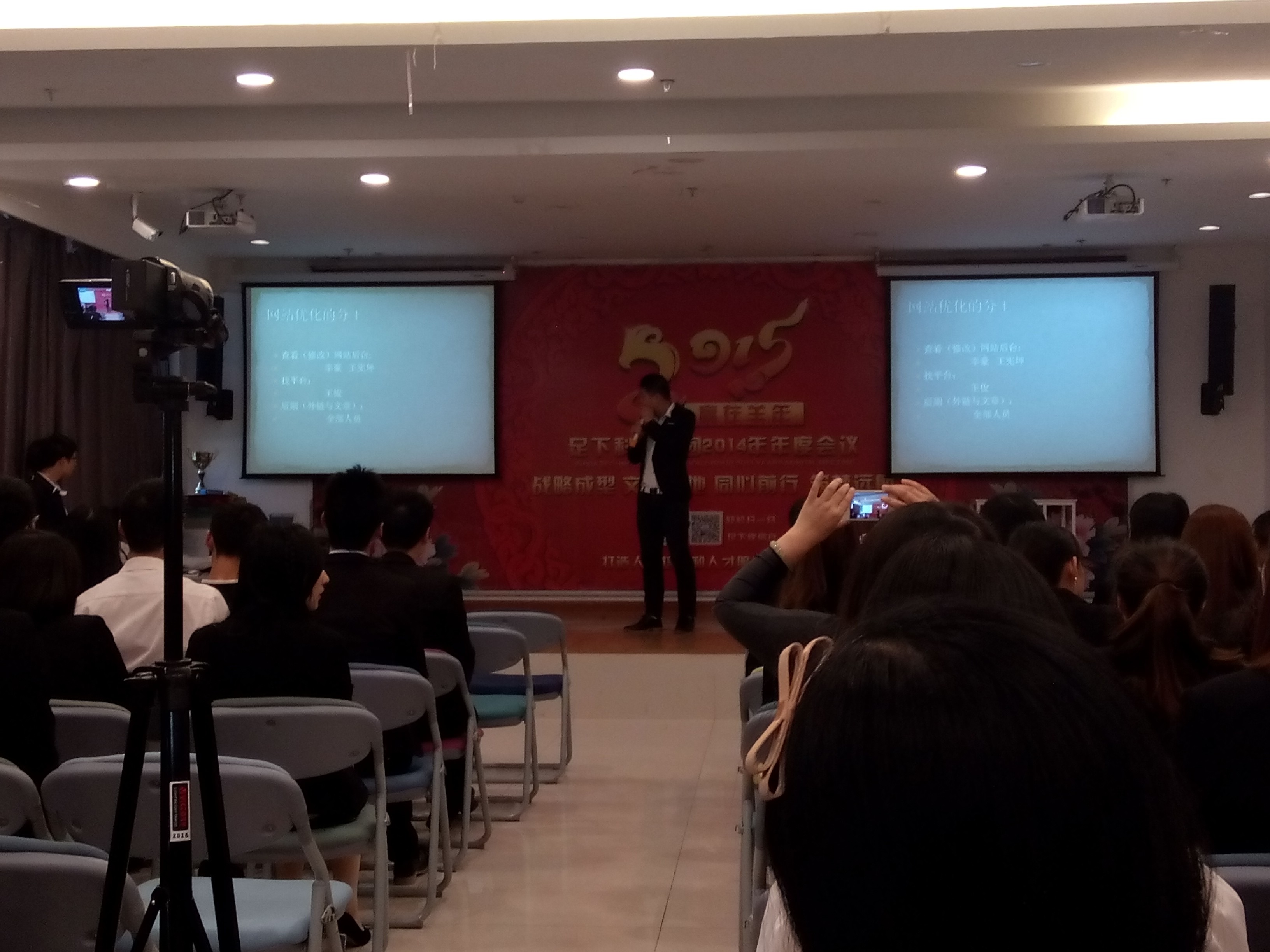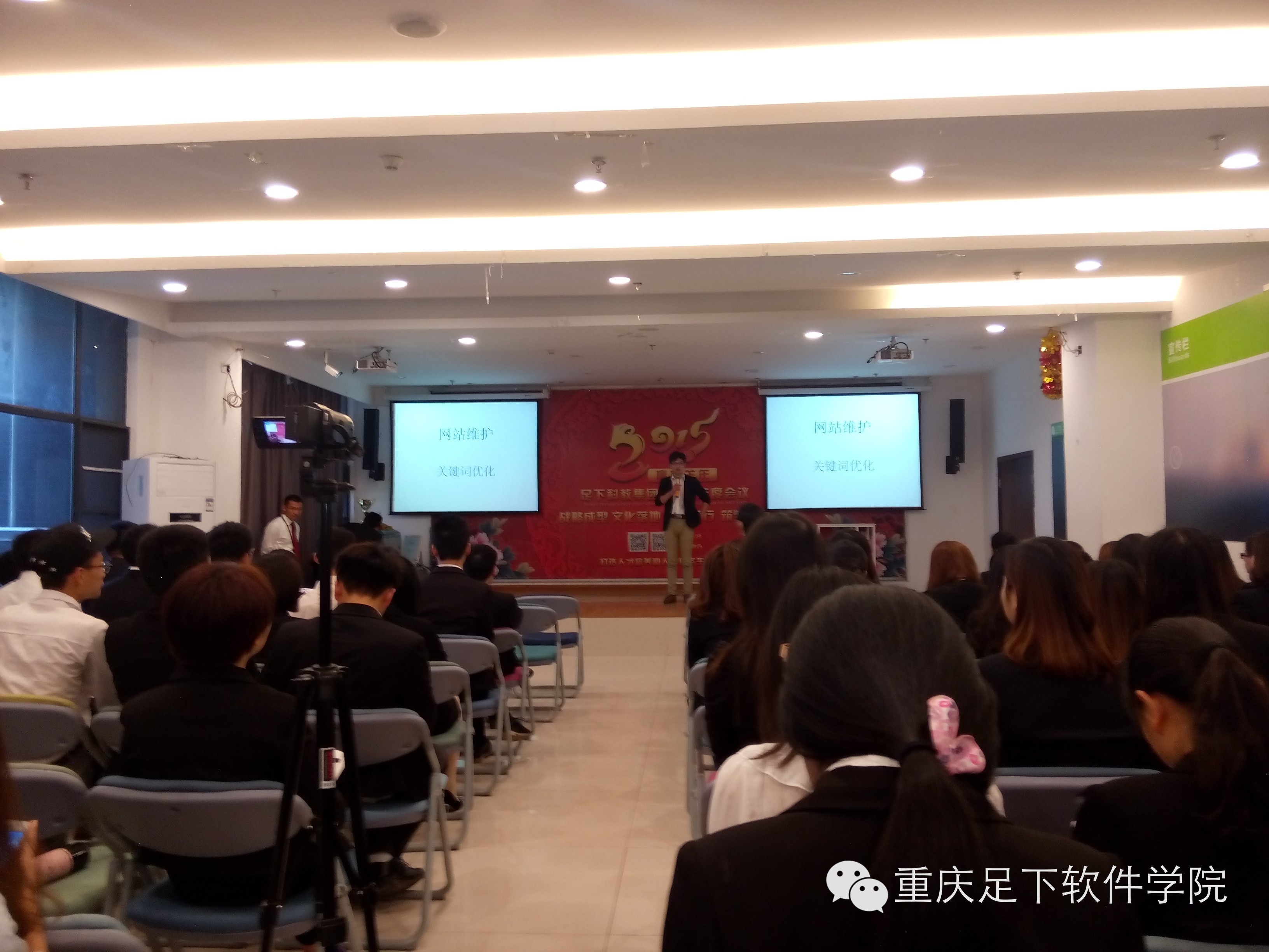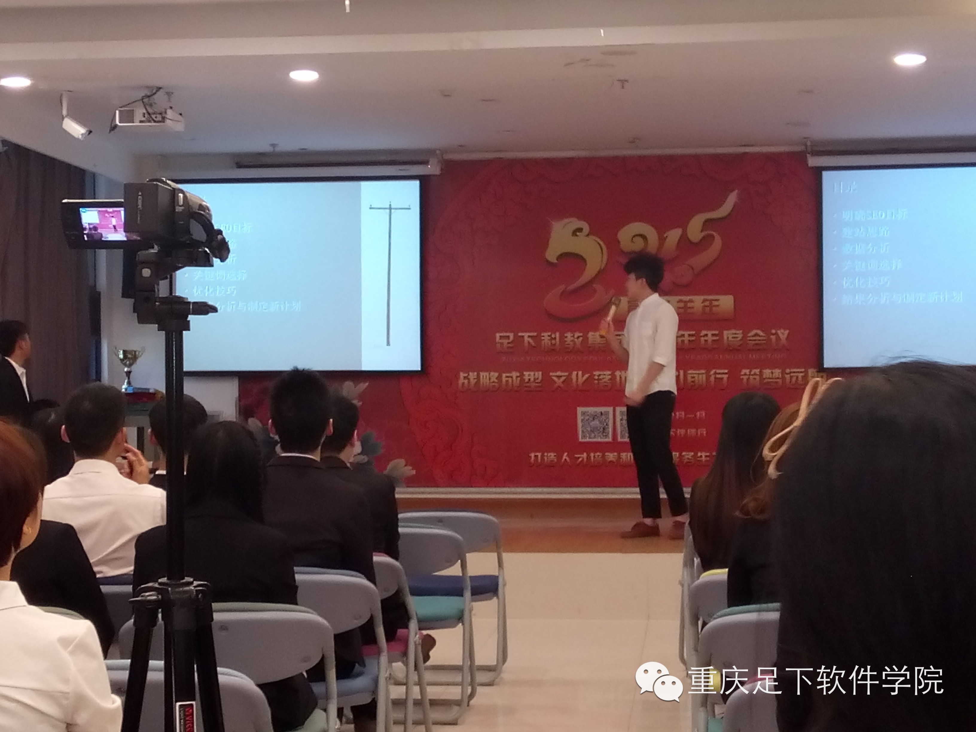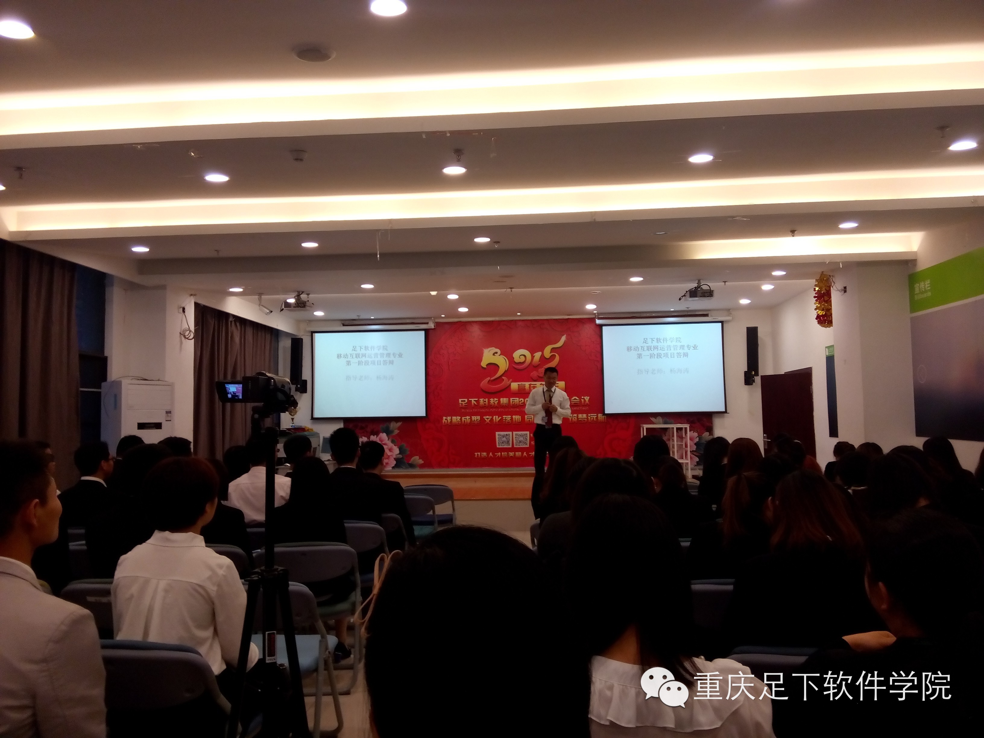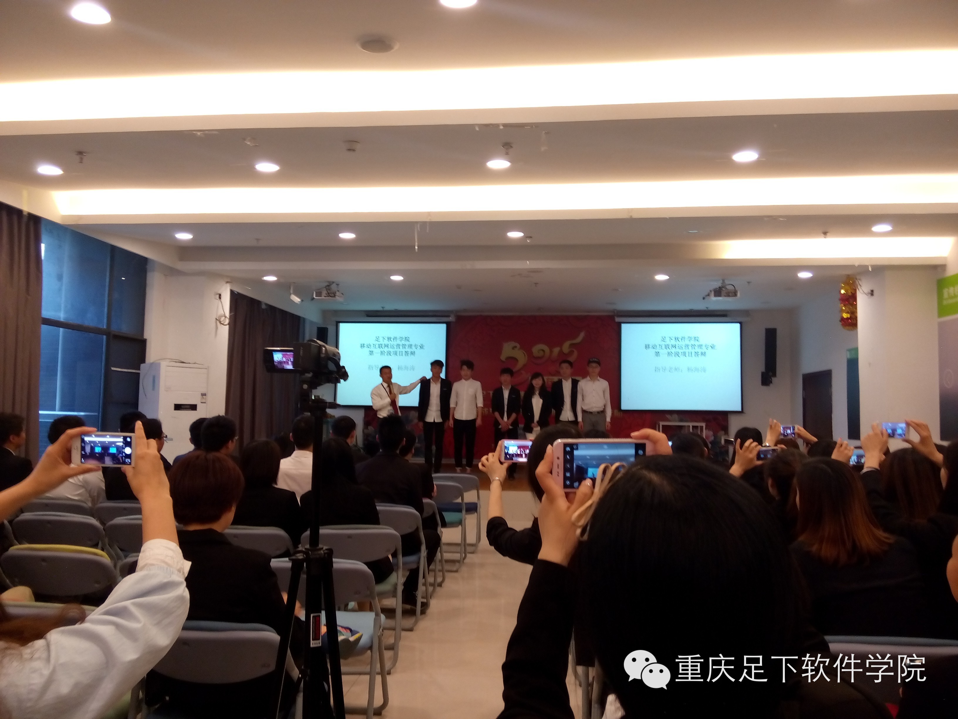 足下软件学院 讯:2015年4月14日上午9点,足下科教集团迎来了足下软件学院移动互联网运营管理专业OM1班的精英学员们的第一阶段项目答辩会议,足下科教集团招生部、学术部的老师们和OM1班全体同学参加了此次答辩会议。项目答辩在主持人卢卫中老师带领全员舞动的一场“抓钱舞”后火热启动。