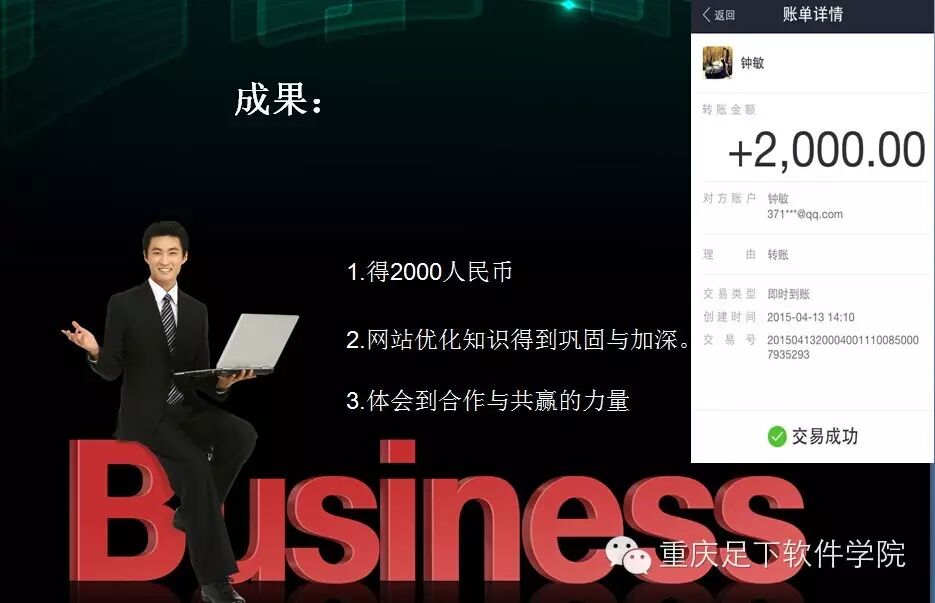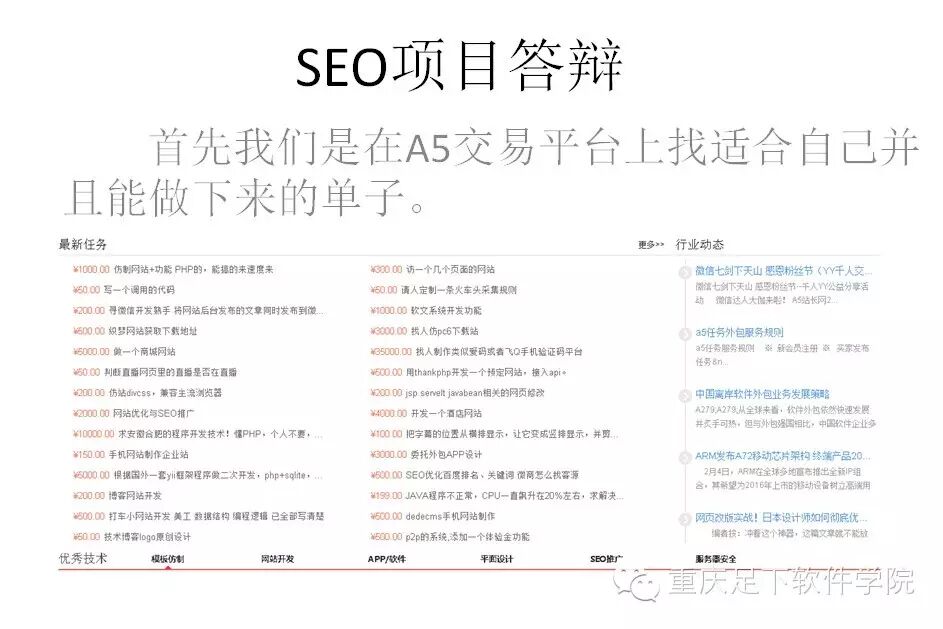1、网站seo优化类项目:主要是对客户的网站进行关键词排名优化、外链优化、友情链接优化和网站内容的更新维护与专题制作推广等,多数学员接到了此类项目,并且都能凭借自己的专业能力达到客户的要求目标,获得了不菲的收入,其中有一组学员不到一个月时间平均每人赚取了近2000元!