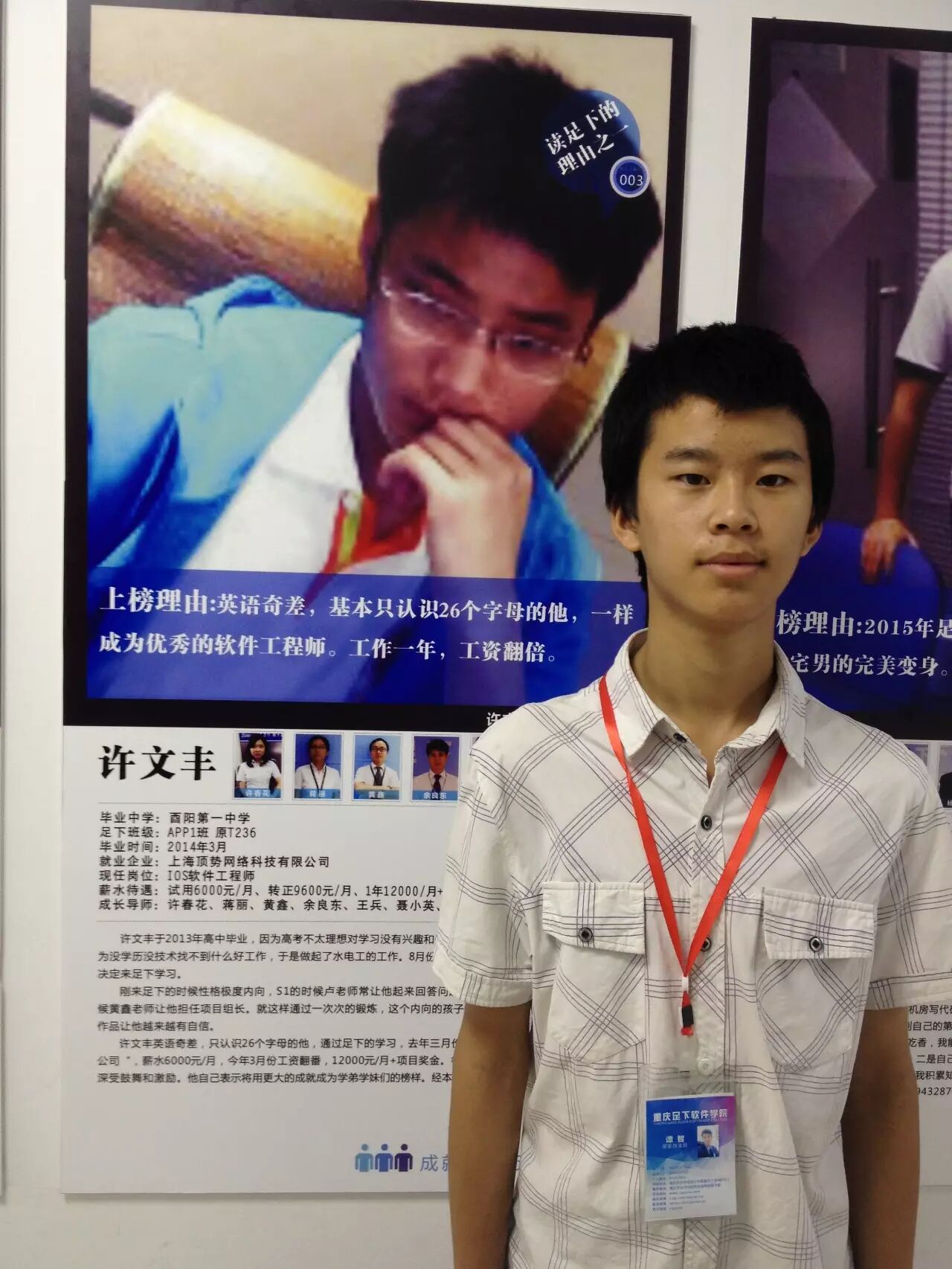 2015年7月10日来足下报名,就读T331班。在榜样前面照像,树立自己的目标:毕业试用期工资6000元。