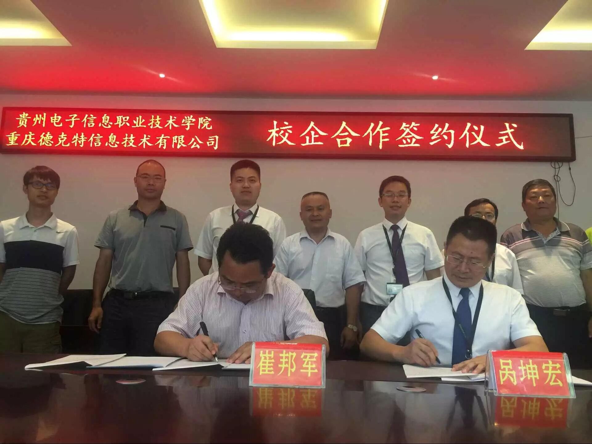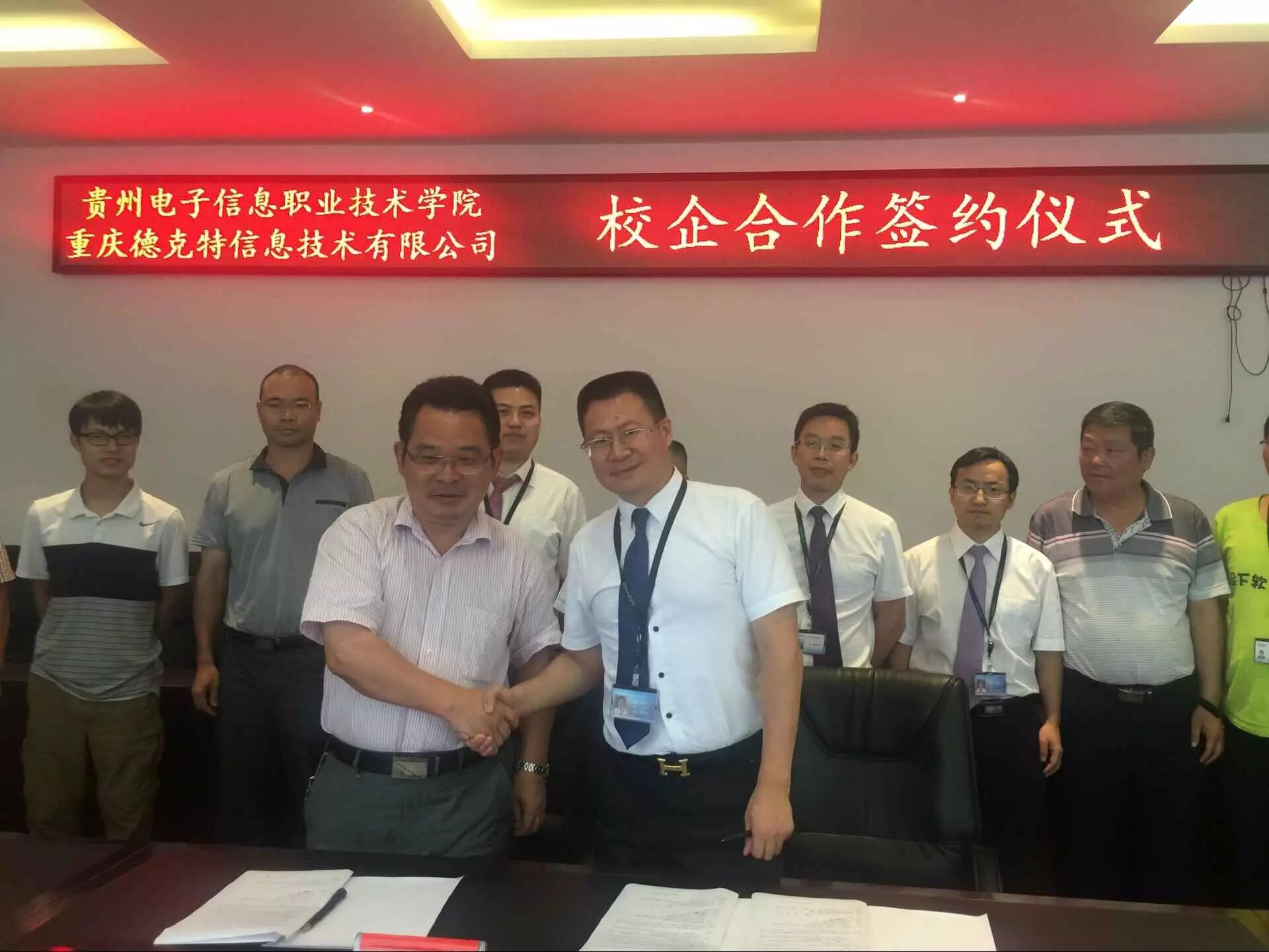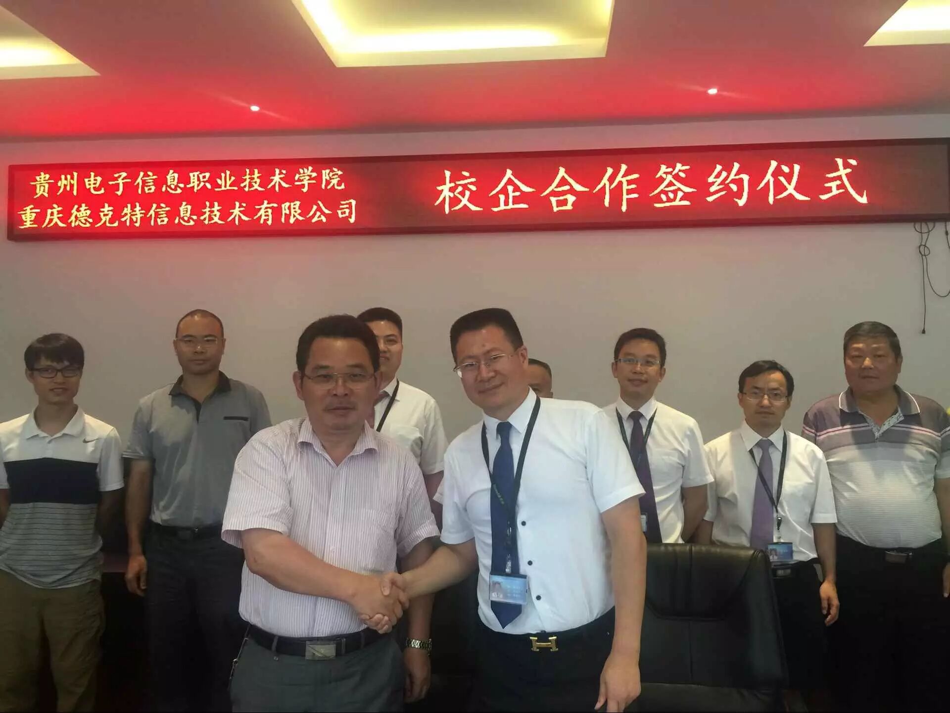 8月6日, 贵州电子信息职业技术学院与足下科教集团-重庆德克特信息技术有限公司进行了人才培养深度校企合作签约并成功开始运作。贵州电子信息职业技术学院崔邦军院长等校领导、足下科教集团-重庆德克特信息技术公司董事长呙坤宏先生、足下科教集团黄磊先生、麻清应先生、德克特公司商务合作部总监周继松先生等人出席签字仪式。