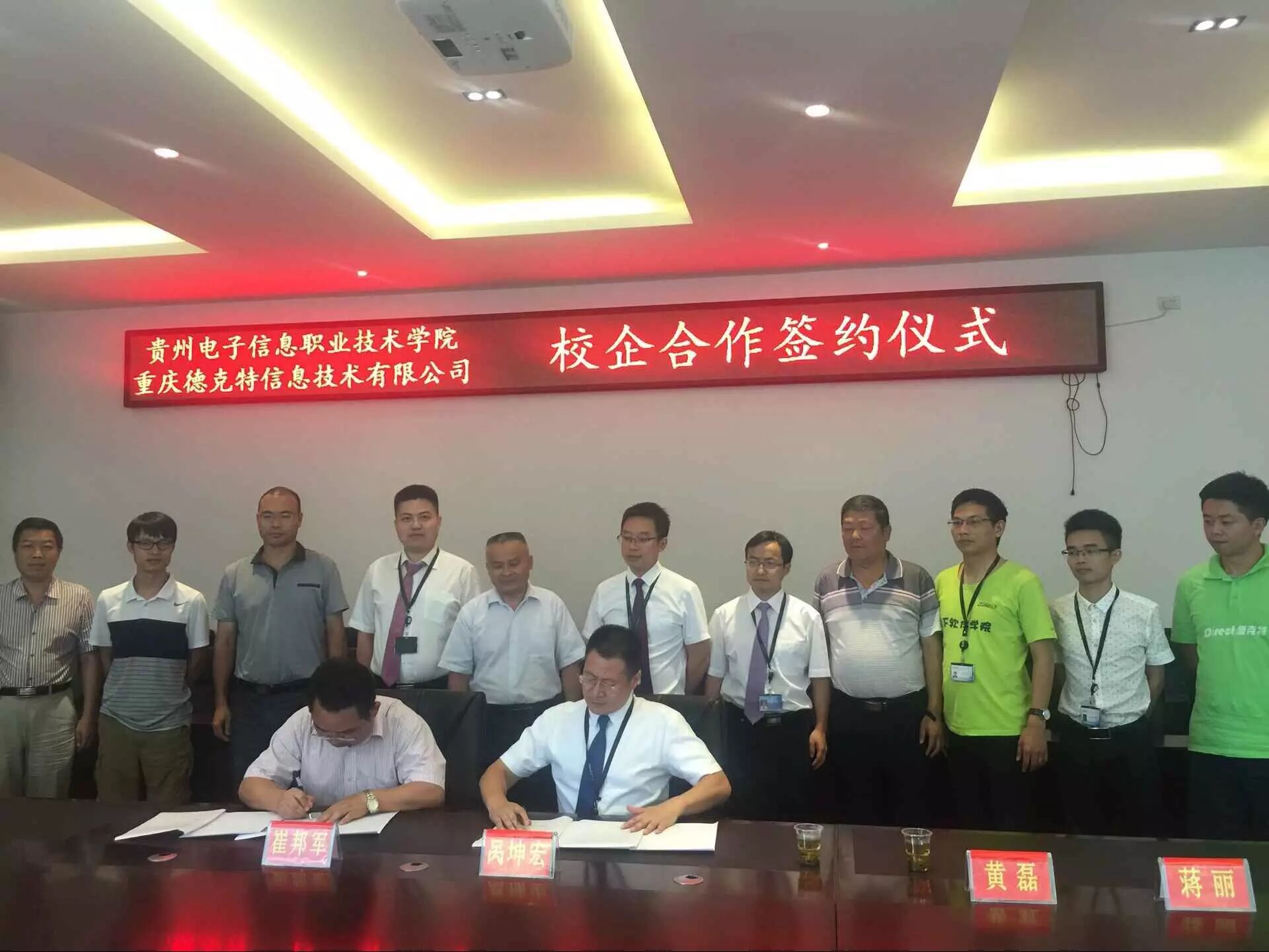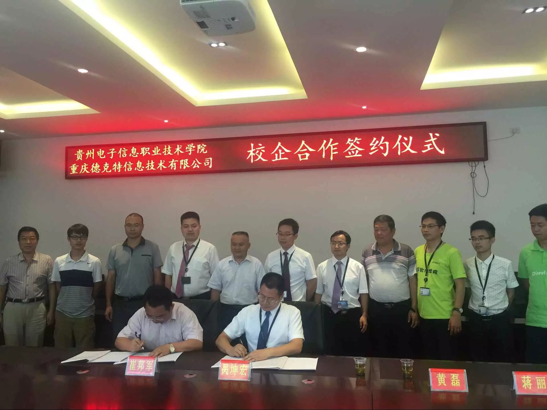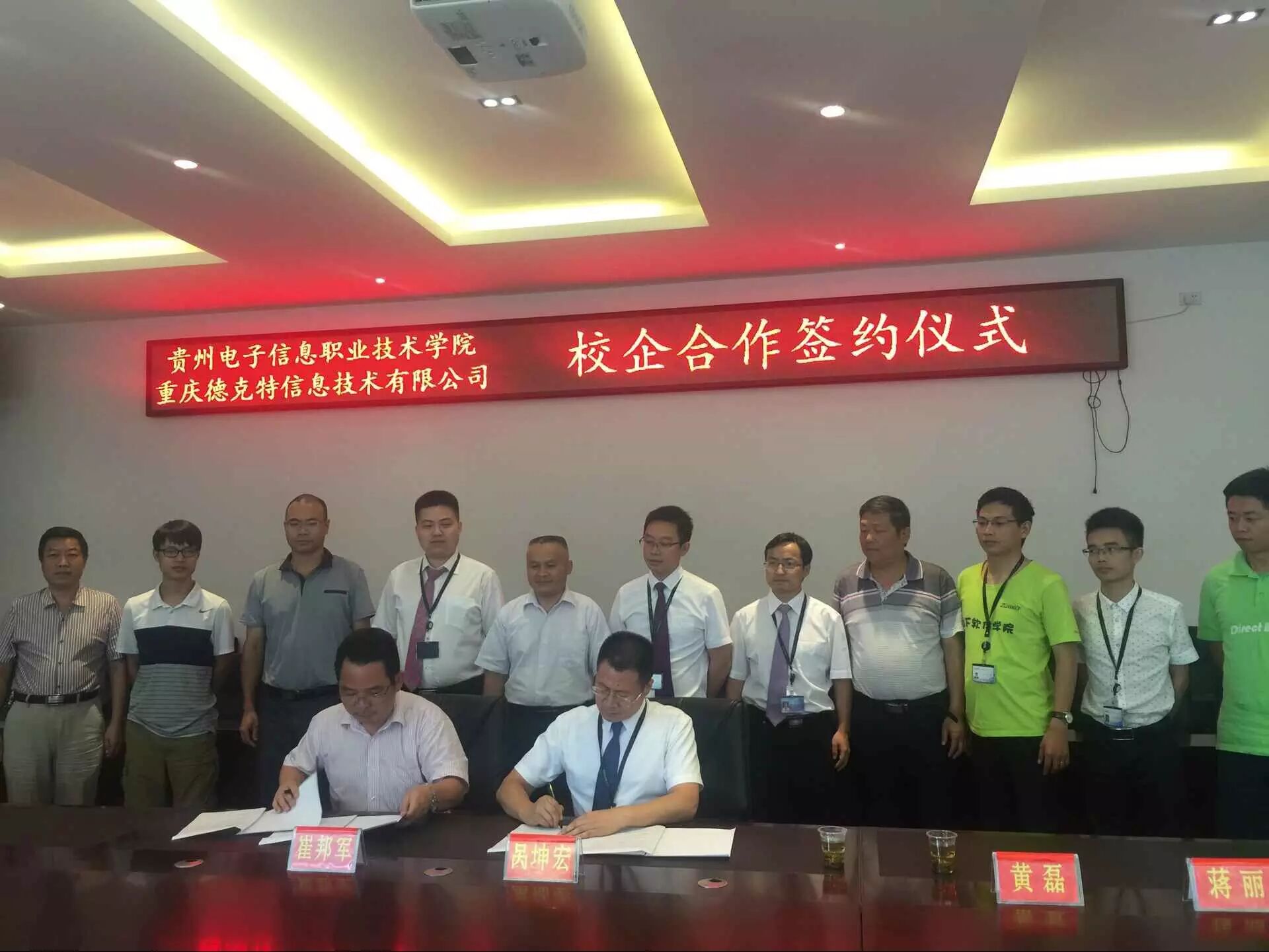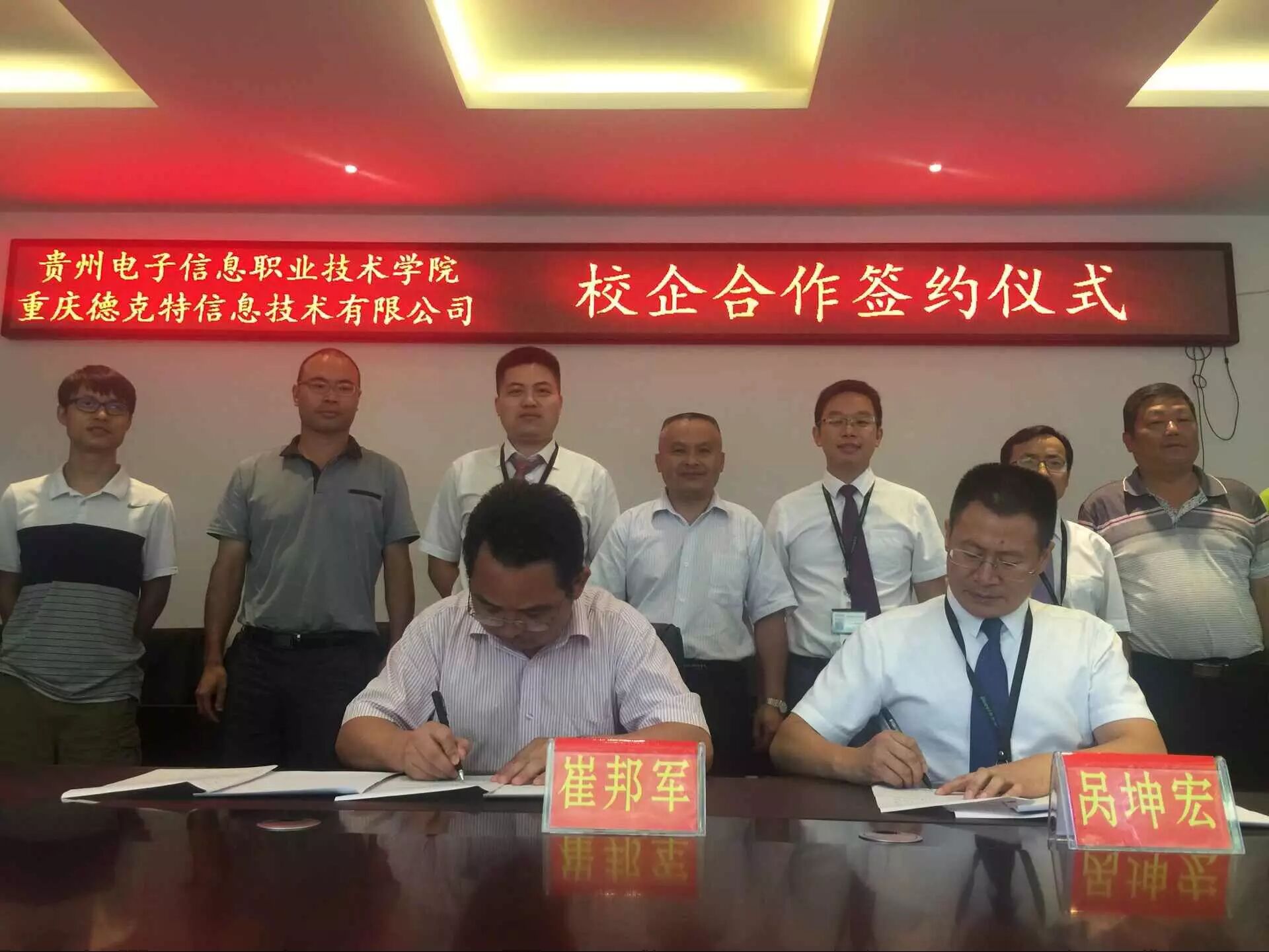 8月6日, 贵州电子信息职业技术学院与足下科教集团-重庆德克特信息技术有限公司进行了人才培养深度校企合作签约并成功开始运作。贵州电子信息职业技术学院崔邦军院长等校领导、足下科教集团-重庆德克特信息技术公司董事长呙坤宏先生、足下科教集团黄磊先生、麻清应先生、德克特公司商务合作部总监周继松先生等人出席签字仪式。