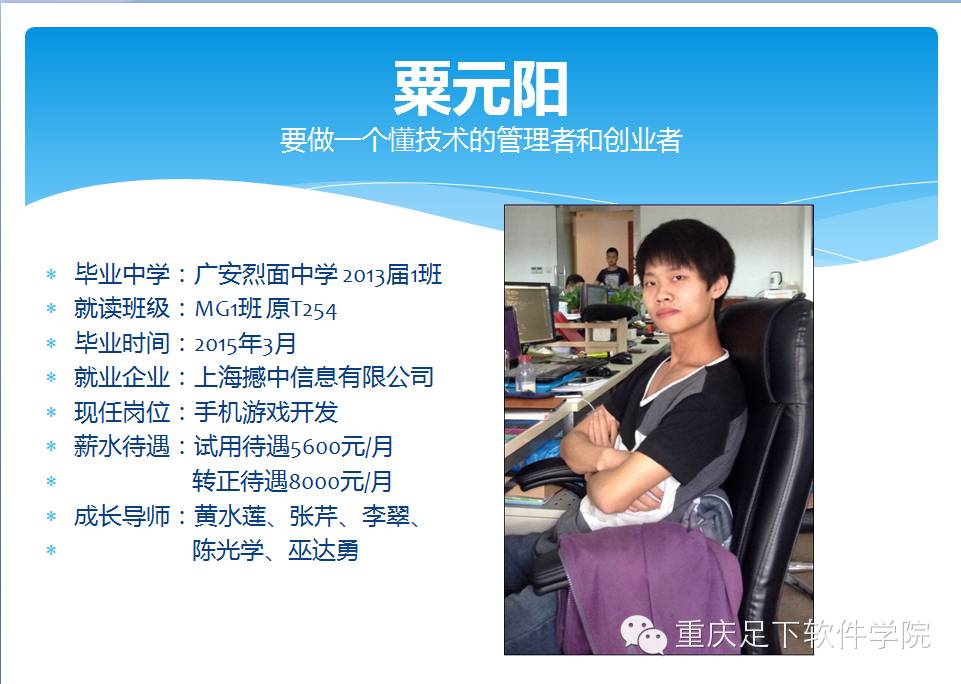 毕业于重庆足下软件学院 MG1班(手机游戏开发方向)。毕业后就业于上海撼中信息有限公司,转正同样拿到了高达8000元的月薪。他的梦想远超一般同龄年轻人,他想在两年内拥有自己的游戏开发公司,要做一个懂技术的管理者和创业者。当年他是汶川大地震的受害者,房子震塌了,他却跟爸爸说 : 要么在城里买,要盖就盖最好的。他不畏困难、不畏盆困、不屈服命运、乐于助人!