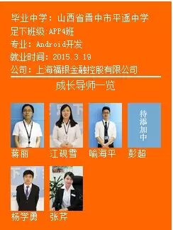 毕业于重庆足下软件学院 Android3班 原T223班。毕业后就业于北京航天宏图信息技术有限责任公司,工作一年后享受着优厚的待遇:月薪8500(基本工资)+300(餐补)元/月+各种福利。她在足下收获了学业、收获了爱情、收获了思维、收获了梦想...她工作半年获得优秀员工奖,工作一年成为优秀管理型人才。她目前是公司Android组组长,被领导器重,经常跟着领导走南闯北。而她的男朋友叫张建,也是足下的学子,毕业于足下T212班,目前也在北京工作,他们在北京过着浪漫的小资生活。