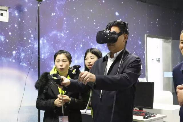 领导们在参观了VR、机器人、3D打印机、无人机体验室时,呙董为领导们介绍了四大专业的发展情况,以及未来几年人才的需求情况,领导们还纷纷体验了VR游戏。
