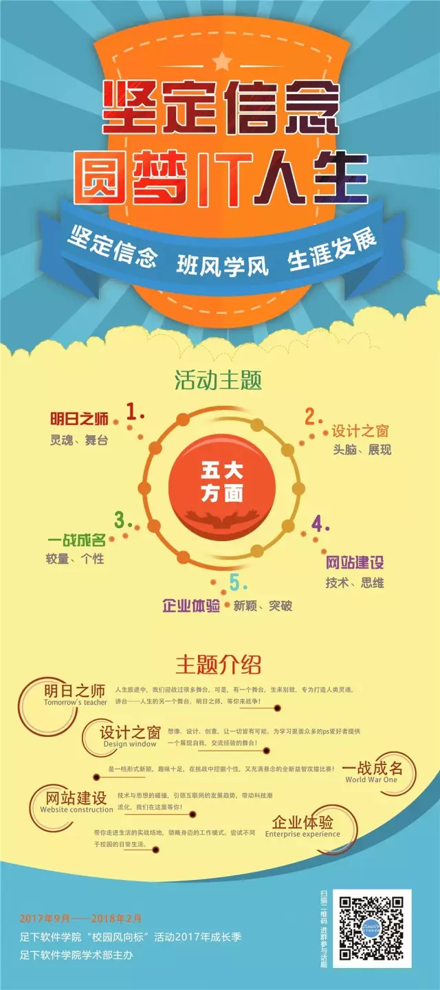 为更进一步活跃校区学术氛围、激励学员学习热情,增强学员就业竞争力,提升老师的教学能力,重庆足下软件学院于2017年下半年将隆重举办2017“校园风向标”系列活动,活动将采取竞赛的形式与大家相见,将围绕坚定信念、班风学风、生涯发展为主题,包含明日之师、设计之窗、一站成名、网站建设、企业体验五个活动内容,通过主题演讲、现场PK互动、作品展示等形式,使学生将所学和实际项目联系起来,进一步提高学员的竞争力,让学员在IT这个广阔的大舞台上尽情展示年轻的风采。