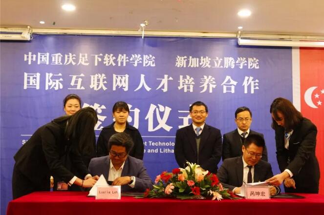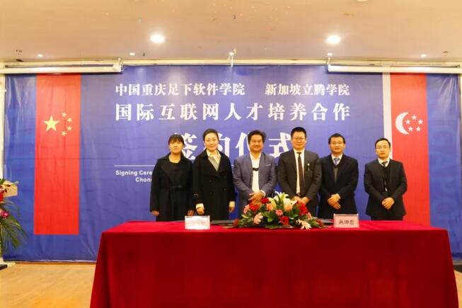 2017年12月8日上午,中国重庆足下软件学院与新加坡立腾学院“国际互联网人才培养合作”签约仪式在足下科教集团西永教学实训基地正式举行。立腾学院首席执行官Leslie Loh、国际合作负责人Tracy、国际合作负责人Susan、足下科教集团董事长、重庆足下软件学院校长呙坤宏、足下科教集团教学副总卢卫中、足下科教集团市场副总黄磊等相关领导和嘉宾出席仪式,在来自媒体和重庆足下软件学院300多名师生代表的见证与支持下,签约仪式圆满成功。