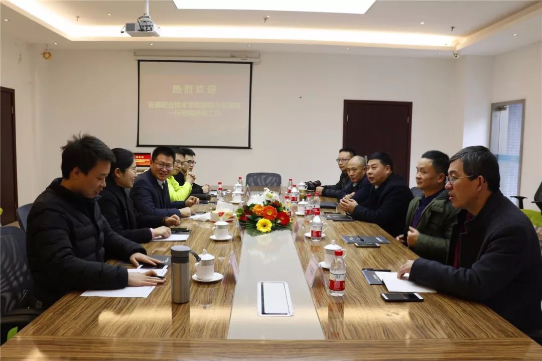 12月28日,安康职业技术学院副院长赵德安、招生处处长张勇、教务科研处处长元国志、就业创业处处长孙艳诚、工程学院副院长李辉东一行领导莅临足下·德克特信息技术有限公司指导工作,重庆足下科教集团董事长呙坤宏、总监赵荣娟、区域经理黄洁热情接待来宾。