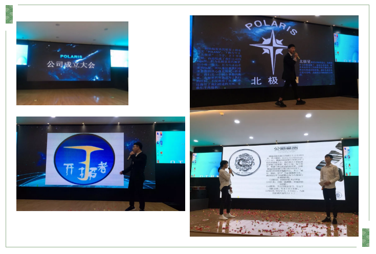 各公司分别上台介绍公司名称、log,公司高层代表上台致辞并展示自己的《成长规划书》,并带领公司成员进行节目表演。足下老师为各公司总监颁发任职聘书,希望各总监完成自己应尽的职责并让公司发展更加长远强大,希望在他们的决策及管理下,员工朝气蓬勃,公司蒸蒸日上。随后,公司总经理进行公司成立剪彩仪式,表示公司成立大会圆满结束。