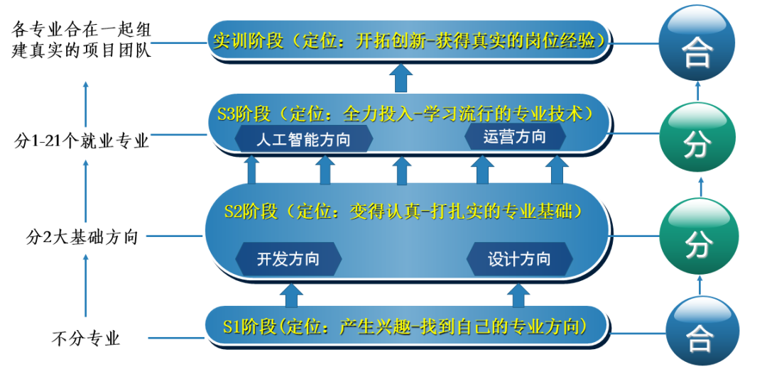 合-分-合的培养模式采取大专业群的设计思路,通过三个阶段能让学生逐步找到最适合自己的专业方向,符合职业教育的规律。合分合最大的好处是:让每个学生都可以找到适合自己的专业方向(足下开设的专业都是市场所需的,没有好坏之分,适合自己的才是最好的),从而可以让每个学生都可以实现专业对口就业。