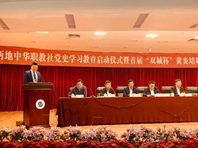 重庆足下软件学院院长呙坤宏到场参加党史学习教育启动授旗仪式并接受颁奖,作为获奖单位代表在大会上发言,现场接受媒体采访。