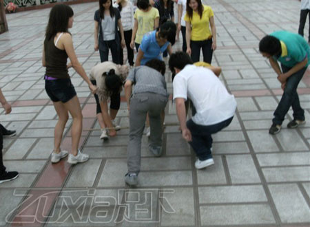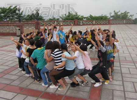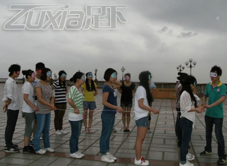 明白了活动细则,个小组选出队长,起对名,喊队伍的口号。所以学员以饱满的激情投入接下来的活动。也许是还没有完全融入队伍中,第一次完成的很差。想象的太过美好F现实就给我们这样的打击。失败的自然是有惩罚的,没有了之前的轻率的笑声了,我们不服气了,第一次总会有些不适应的,我们大声的喊着:“我们不服!我们不服!”。再一次,我们没有失误,完美的完成这项活动。在第二次活动开始前,队长让我们进行了总结,反省,商讨-----我们缺乏的是团队的合作。第二次的成功,我们显然更加的兴奋了,都笑了……是真正的投入了。