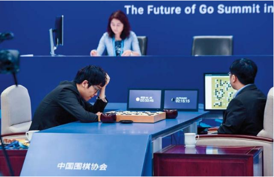 2017年5月27日,中国棋手柯洁(左)在与“阿尔法围棋”的第三场对局中思考自2006年人工智能走出实验室进入到产业化阶段以来,人工智能界在算法理论、基础与平台、应用技术、终端产品、行业应用以及未来探索领域涌现出了诸多领军团队,引领着人工智能的发展方向。