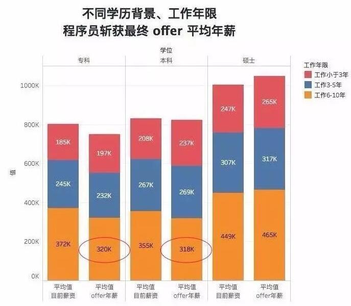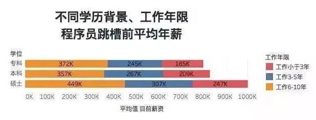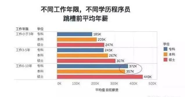 从刚工作时,专科程序员平均跳槽年薪比本科程序员少40K,到工作6-10年,专科程序员比本科程序员平均年薪高出2000元。