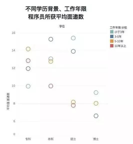 单看收到的面试数量,专科、本科、硕士所收到的邀请数量相差不大,博士生收到的面试邀请反而较少!这也许和他们的专业更精准聚焦有关系吧!如果工作经验达到了10年,低学历的程序员更加吃香,专科生和本科生收到的面试邀请数要多于硕士生!