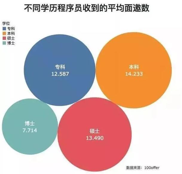 如果你是初高中学历,本身高中生也能找到不错的工作,而且完全可以通过自考拿到一个专科证甚至本科证。如果你拿不到,只能说明你不够勤奋!下面是不同学历的程序员收到的平均面试邀请: