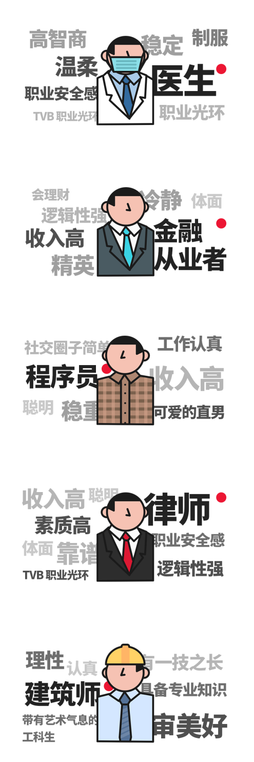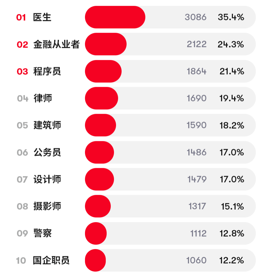 资料显示,医生被选为最受欢迎的理想男友职业首位,有高达35.4%的受访者选择医生作为自己的理想男友职业。程序员则排名第三。公务员和国企职员这类较为稳定的职业也名列前茅。在选择这些职业的原因关键词中,最高频的三个词是:稳定、聪明、高收入。简而言之,稳定、聪明且有钱的男生最受女生欢迎。