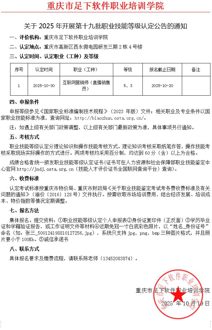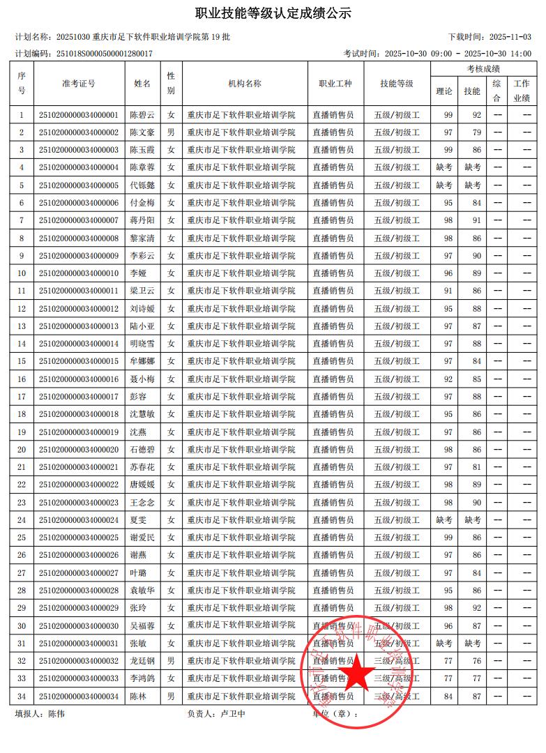 重庆足下软件学院2025年第19批职业技能等级认定成绩公示