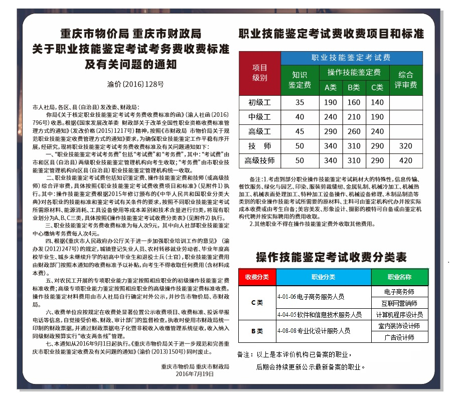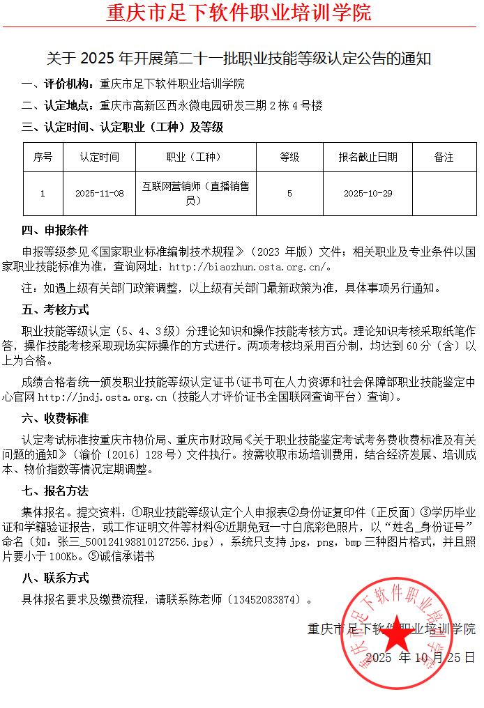 时间:2025-11-06根据《重庆市职业技能鉴定指导中心关于印发〈重庆市职业技能等级认定考试考务工作规程(试行)〉的通知》(渝职鉴发〔2021〕23号)要求,现将本机构“2