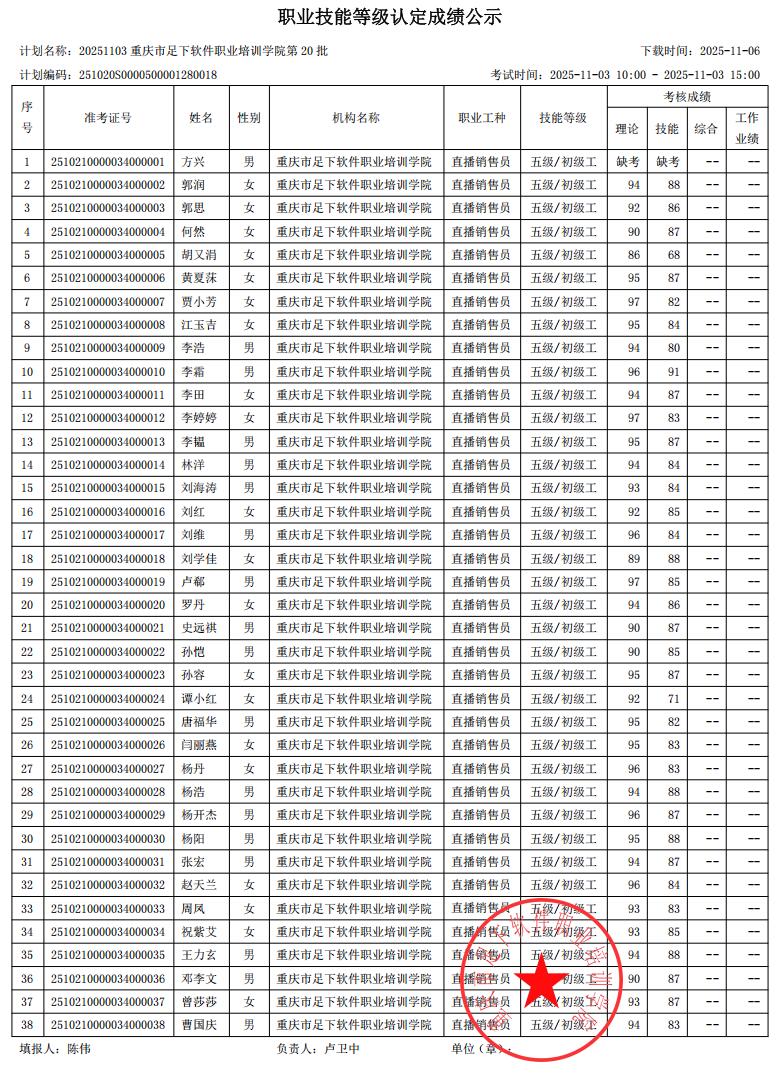 重庆足下软件学院2025年第20批职业技能等级认定成绩公示