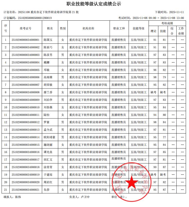 重庆足下软件学院2025年第21批职业技能等级认定成绩公示