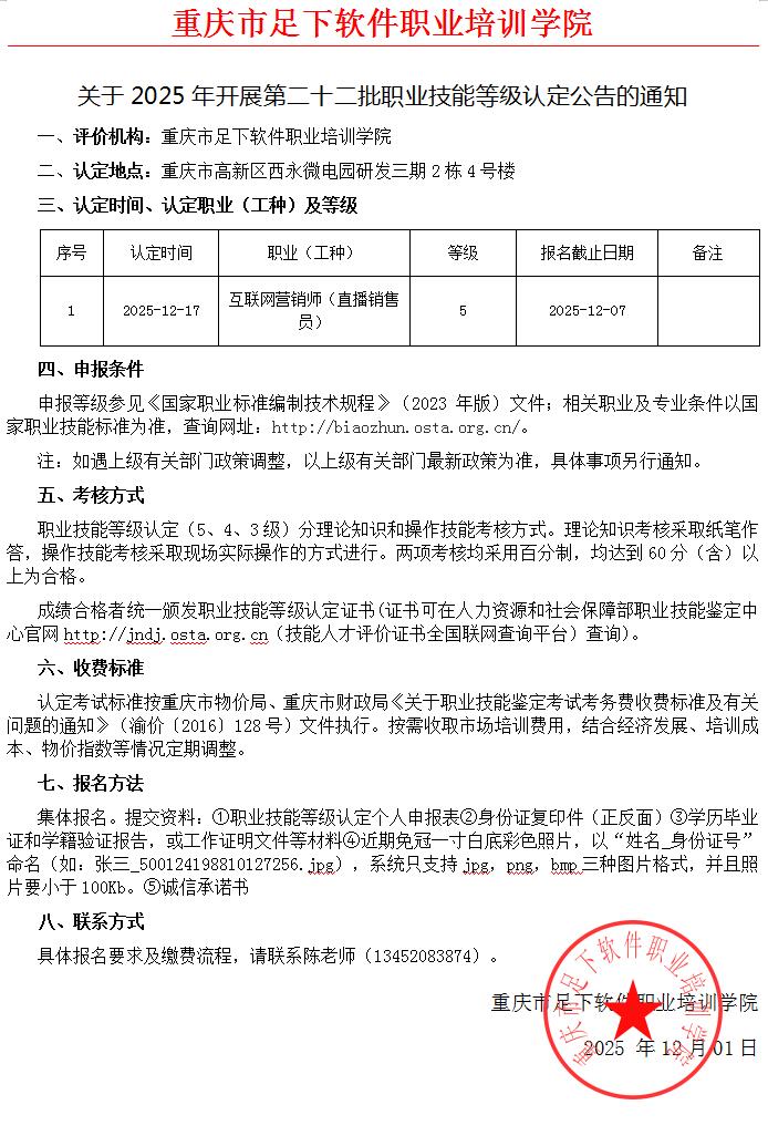 时间:2025-11-11根据《重庆市职业技能鉴定指导中心关于印发〈重庆市职业技能等级认定考试考务工作规程(试行)〉的通知》(渝职鉴发〔2021〕23号)要求,现将本机构“2