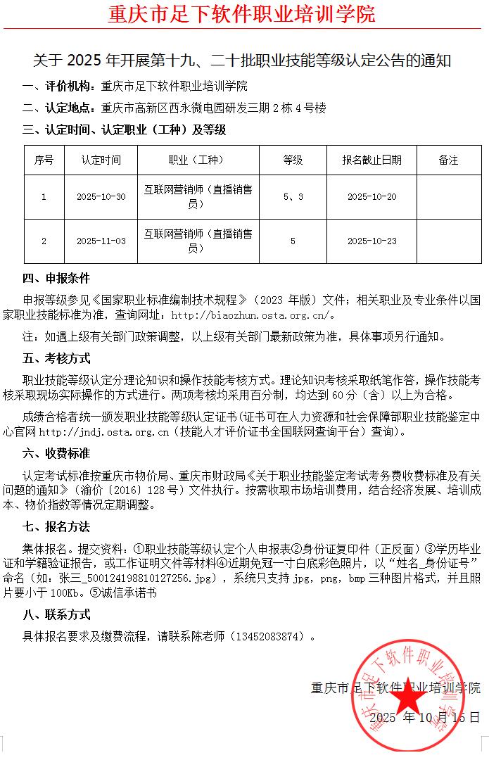 关于2025年开展第十九、二十批职业技能等级认定公告的通知