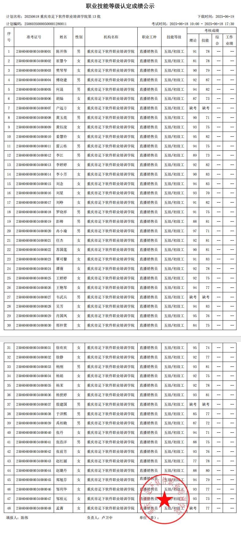 重庆足下软件学院2025年第13批职业技能等级认定成绩公示