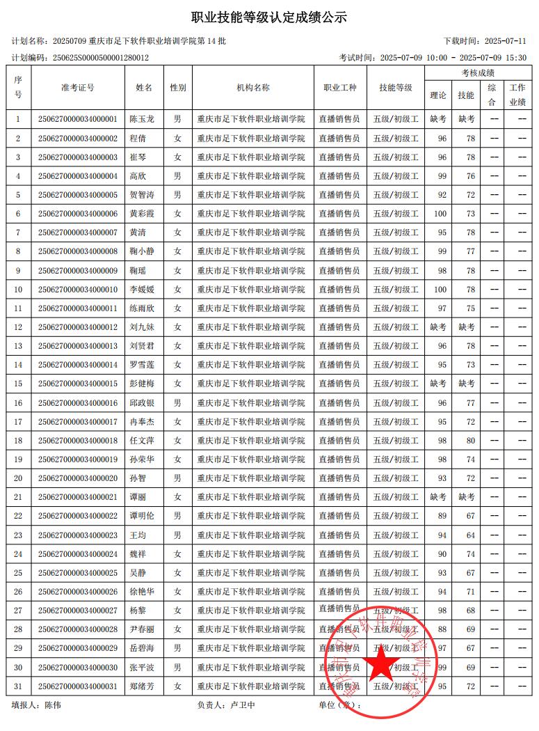 重庆足下软件学院2025年第14批职业技能等级认定成绩公示