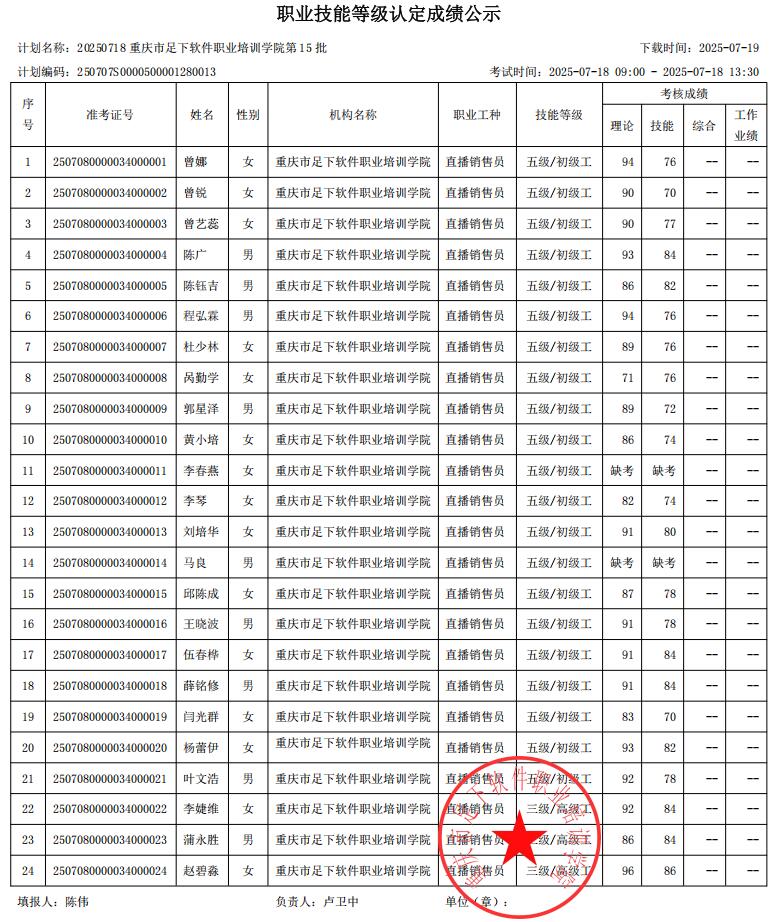 重庆足下软件学院2025年第17批职业技能等级认定成绩公示