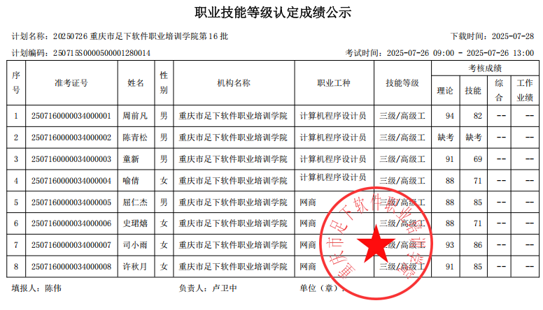 重庆足下软件学院2025年第16批职业技能等级认定成绩公示