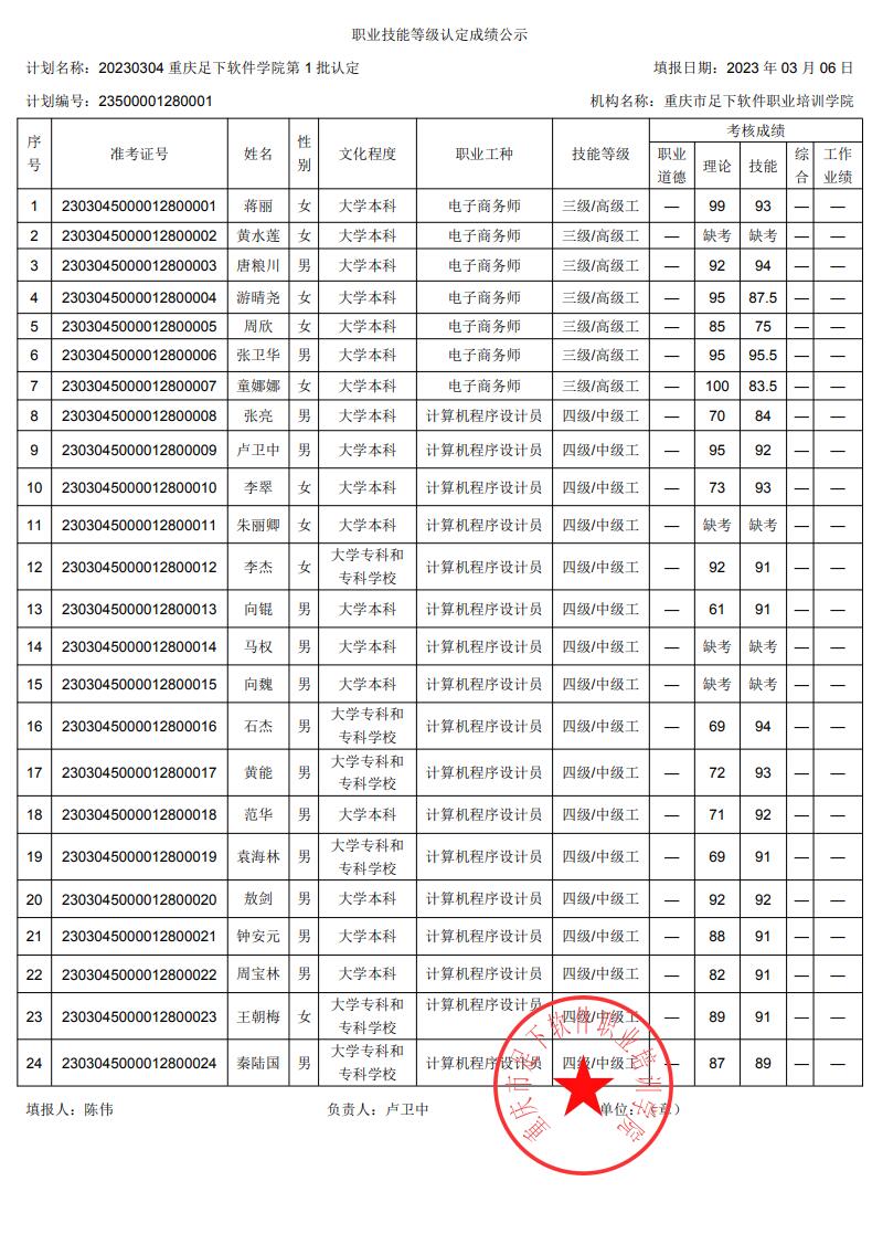 重庆足下软件学院第1批职业技能等级认定成绩公示