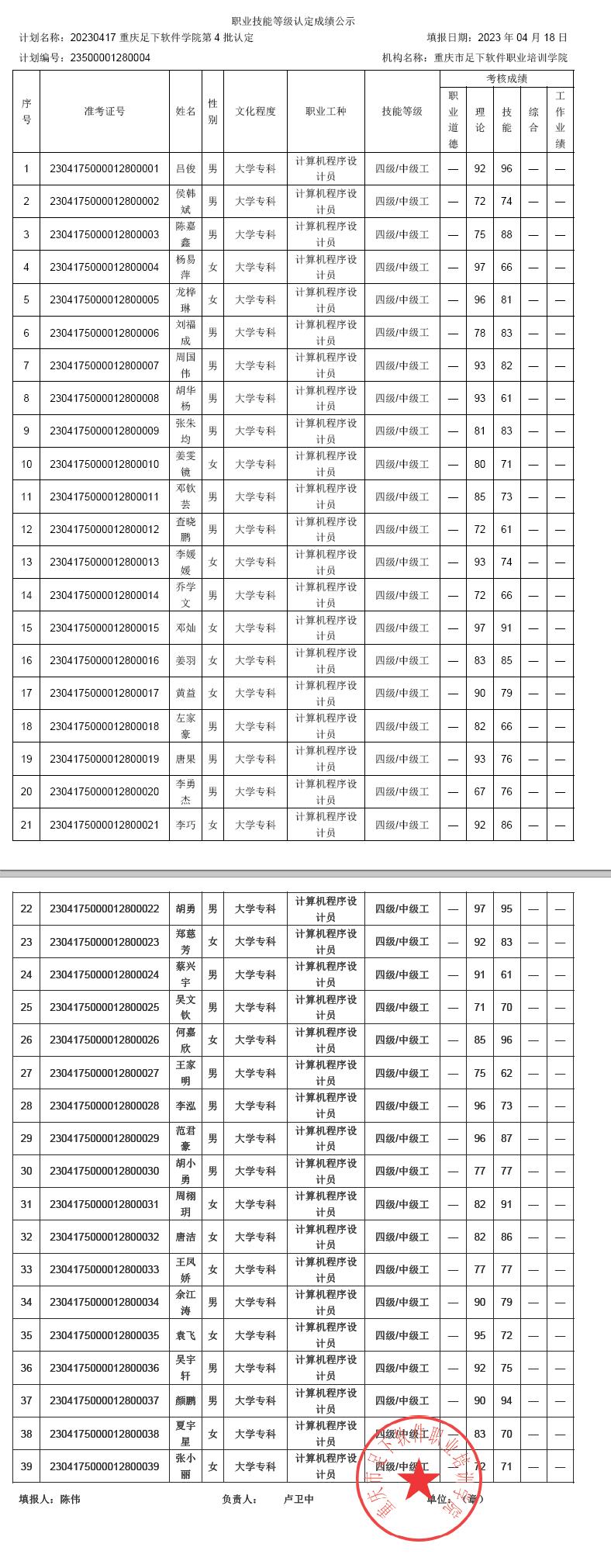 重庆足下软件学院第4批职业技能等级认定成绩公示