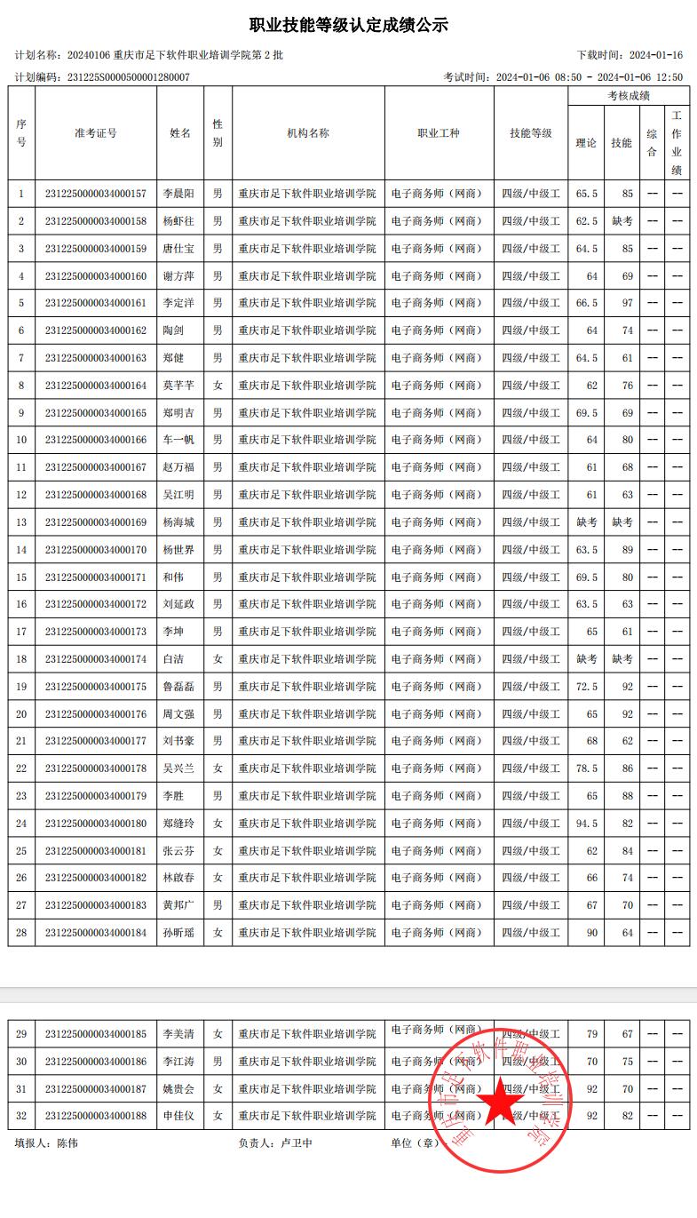 重庆足下软件学院2024年第2批职业技能等级认定成绩公示