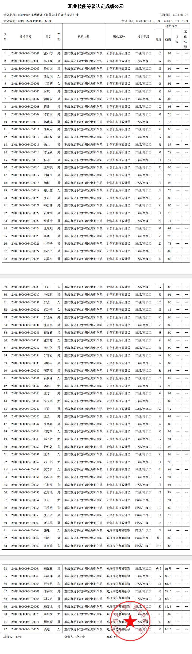 重庆足下软件学院2024年第6批职业技能等级认定成绩公示