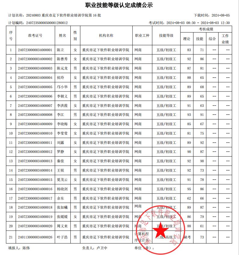 重庆足下软件学院2024年第16批职业技能等级认定成绩公示