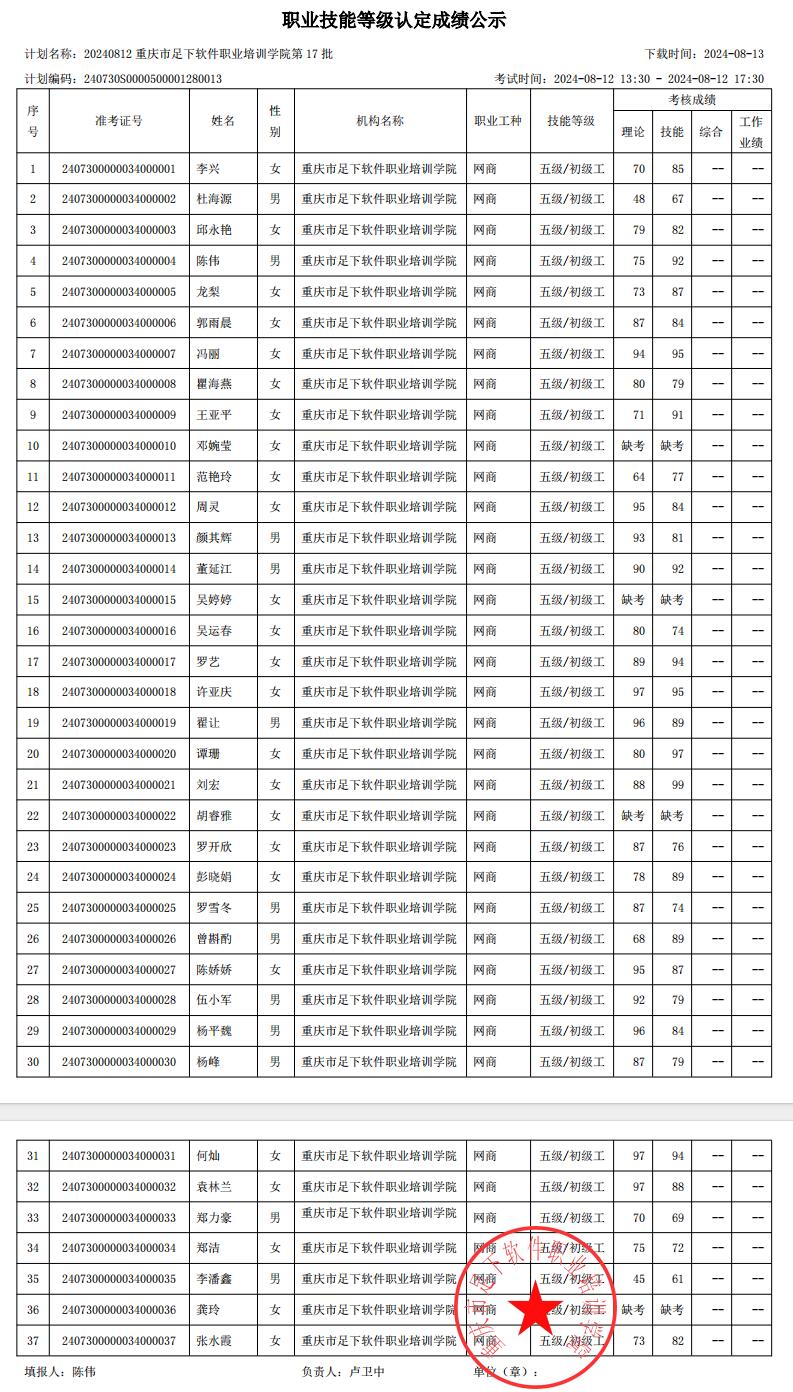 重庆足下软件学院2024年第17批职业技能等级认定成绩公示