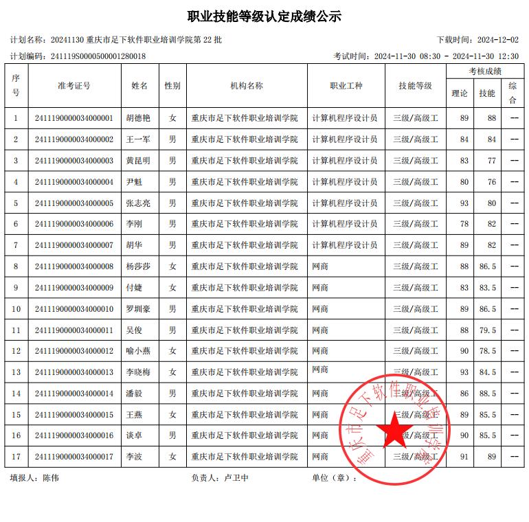 重庆足下软件学院2024年第22批职业技能等级认定成绩公示