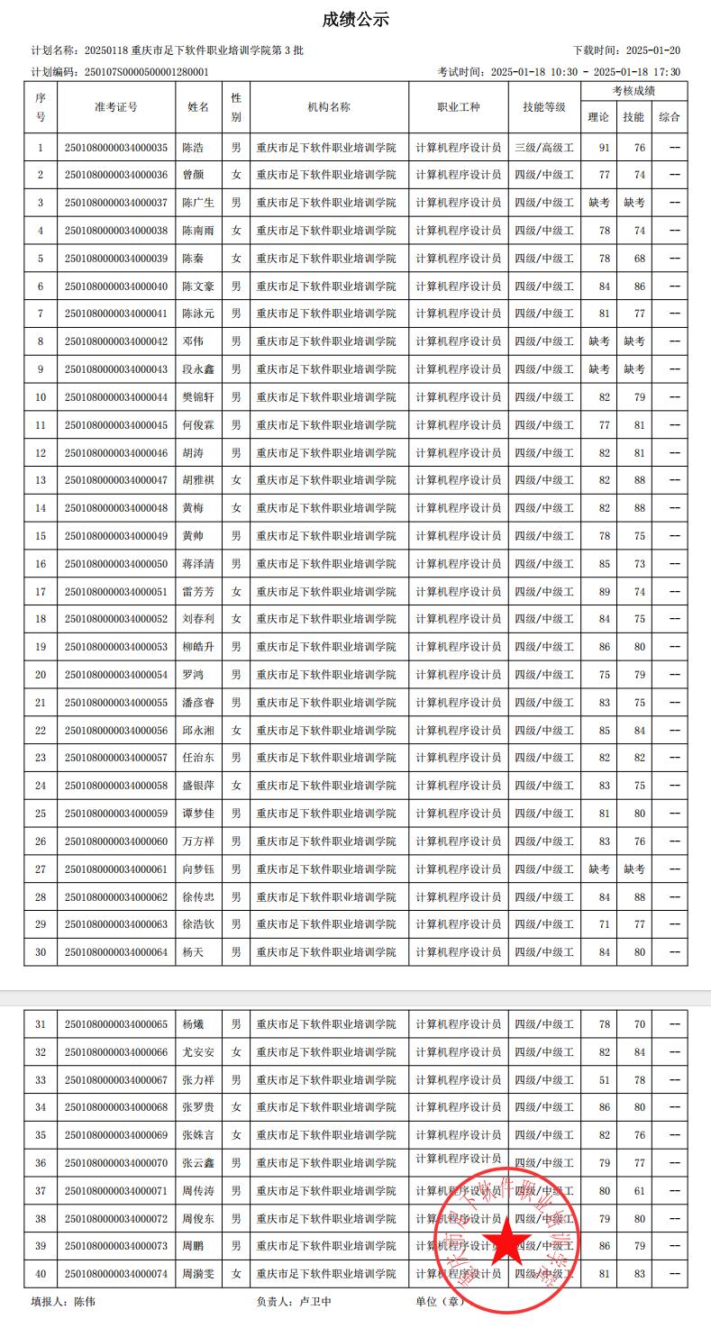 重庆足下软件学院2025年第17批职业技能等级认定成绩公示