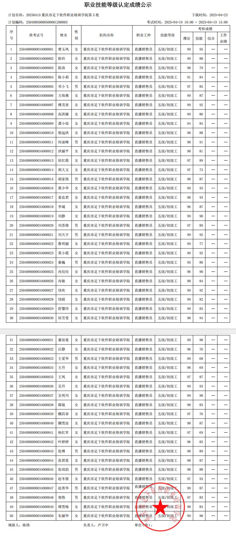 根据《重庆市职业技能鉴定指导中心关于印发〈重庆市职业技能等级认定考试考务工作规程(试行)〉的通知》(渝职鉴发〔2021〕23号)要求,现将本机构“20250419重庆市足下软件职业培训学院第5批”批次成绩予以公示。