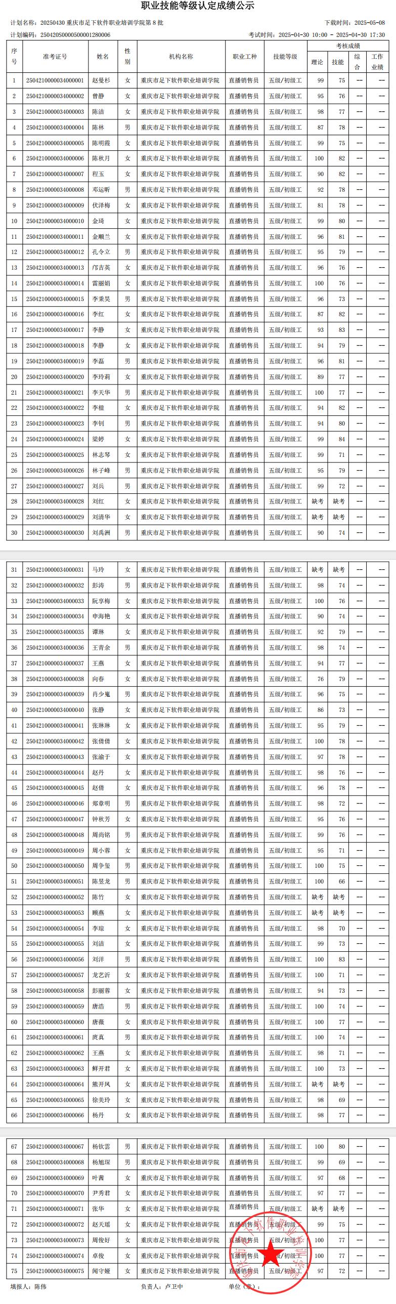 根据《重庆市职业技能鉴定指导中心关于印发〈重庆市职业技能等级认定考试考务工作规程(试行)〉的通知》(渝职鉴发〔2021〕23号)要求,现将本机构“20250430重庆市足下软件职业培训学院第8批”批次成绩予以公示。