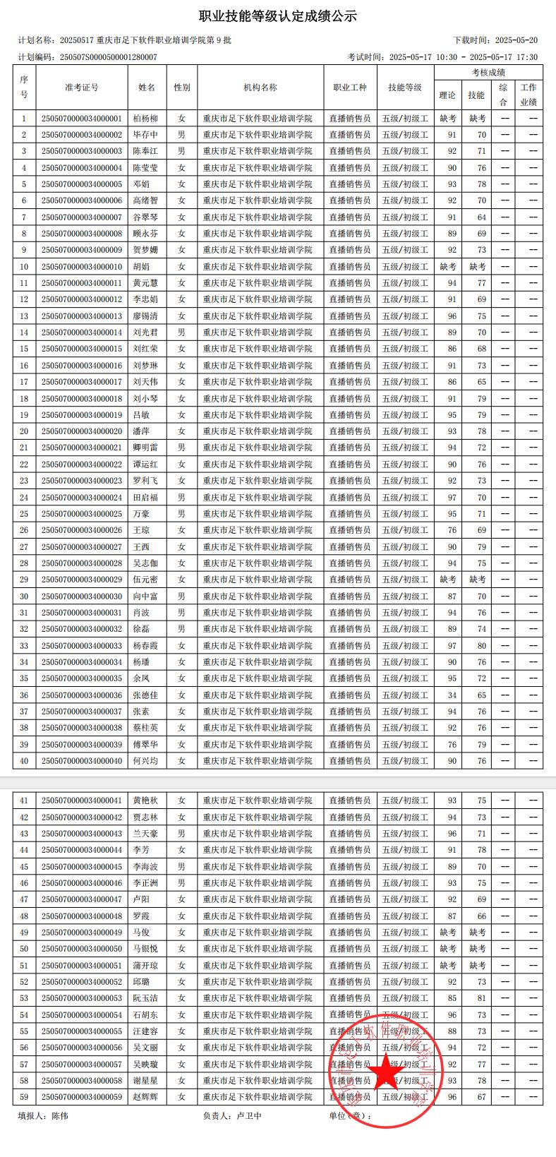 根据《重庆市职业技能鉴定指导中心关于印发〈重庆市职业技能等级认定考试考务工作规程(试行)〉的通知》(渝职鉴发〔2021〕23号)要求,现将本机构“20250517重庆市足下软件职业培训学院第9批”批次成绩予以公示。