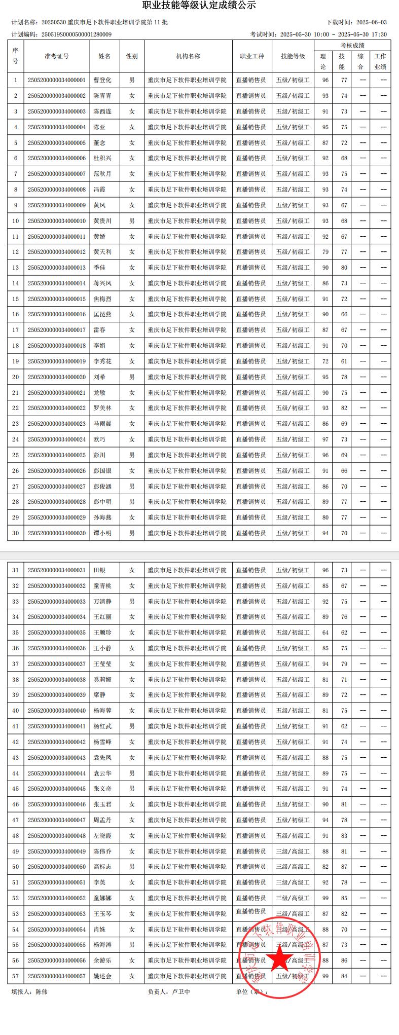 根据《重庆市职业技能鉴定指导中心关于印发〈重庆市职业技能等级认定考试考务工作规程(试行)〉的通知》(渝职鉴发〔2021〕23号)要求,现将本机构“20250530重庆市足下软件职业培训学院第11批”批次成绩予以公示。
