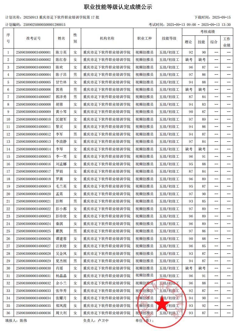 根据《重庆市职业技能鉴定指导中心关于印发〈重庆市职业技能等级认定考试考务工作规程(试行)〉的通知》(渝职鉴发〔2021〕23号)要求,现将本机构“20250913重庆市足下软件职业培训学院第17批”批次成绩予以公示。