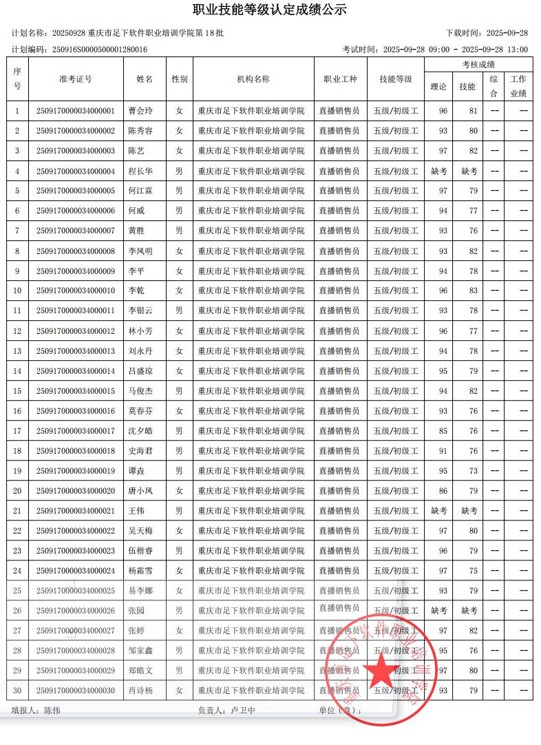 根据《重庆市职业技能鉴定指导中心关于印发〈重庆市职业技能等级认定考试考务工作规程(试行)〉的通知》(渝职鉴发〔2021〕23号)要求,现将本机构“20250928重庆市足下软件职业培训学院第18批”批次成绩予以公示。